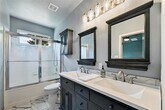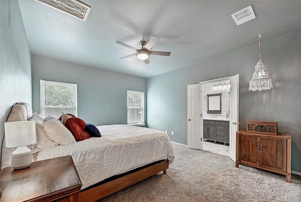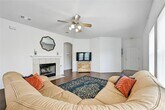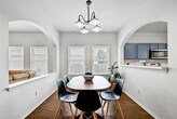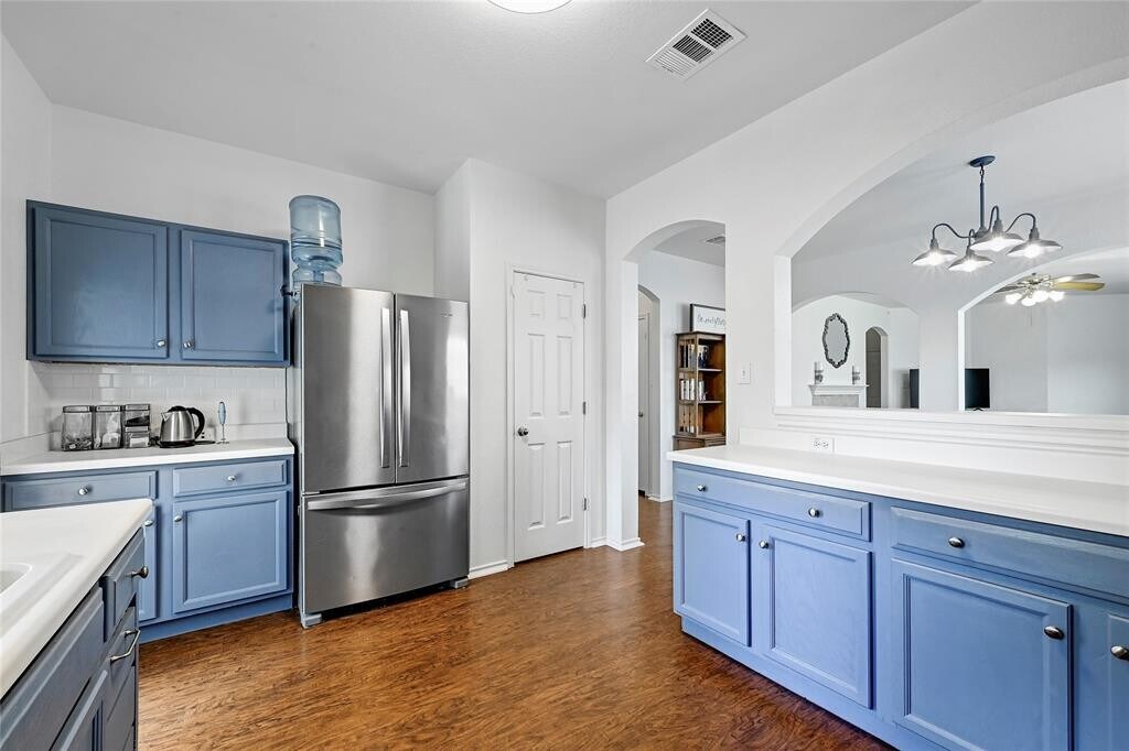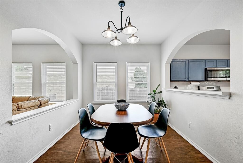 This single-story home offers 4 bedrooms, 2 full bathrooms, and 1,655 sq ft of well-designed living space. Wood flooring flows through the main living areas, creating a warm and welcoming atmosphere. The open floor plan includes a spacious living room and a dedicated dining area, perfect for everyday living. The kitchen features stylish blue cabinets, a white subway tile backsplash, a gas cooktop, built-in microwave, and dishwasher for added convenience. All bedrooms are carpeted, providing a cozy retreat, and the primary suite includes a walk-in closet and private bathroom. Additional highlights include central heating and cooling, a two-car attached garage, and a private backyard with a full 8-foot privacy fence, ideal for relaxing outdoors. Located in the quiet and convenient North Creek neighborhood, close to parks, schools, shopping, dining, and just a short drive to Austin.