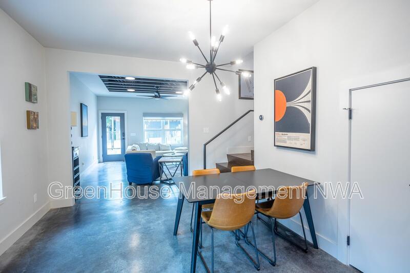 Modern living in the heart of SoFay—where Fayettechill is a lifestyle. This contemporary townhome near Walker Park and Razorback Greenway offers trail access, dining, and entertainment. Features industrial design with exposed beams, concrete floors, and eco-fueled fireplace. Kitchen includes large island, dual wine coolers, and ample storage. Four bedrooms (one down, three up) provide flexibility for guests or offices. Fenced courtyard perfect for pets, plus unique boulder bridge entrance. Oversized carport offers extra storage. Available furnished or unfurnished with 30-day minimum lease. Lawn care and pest control included—spend more time enjoying SoFay, less on chores.