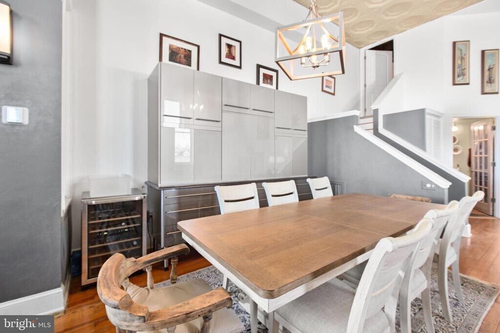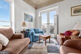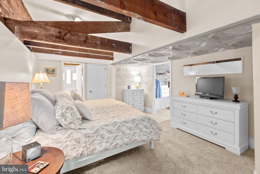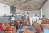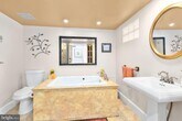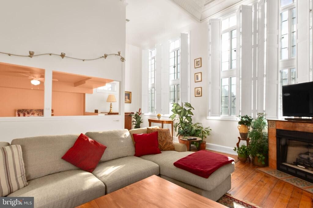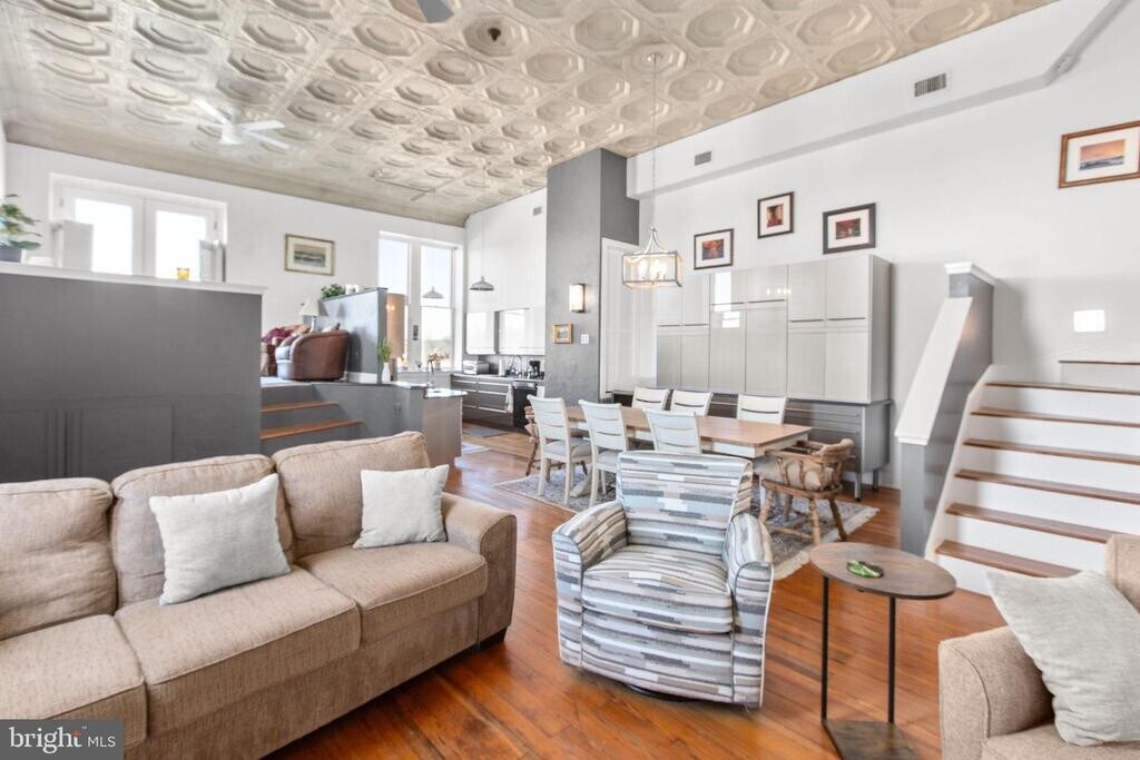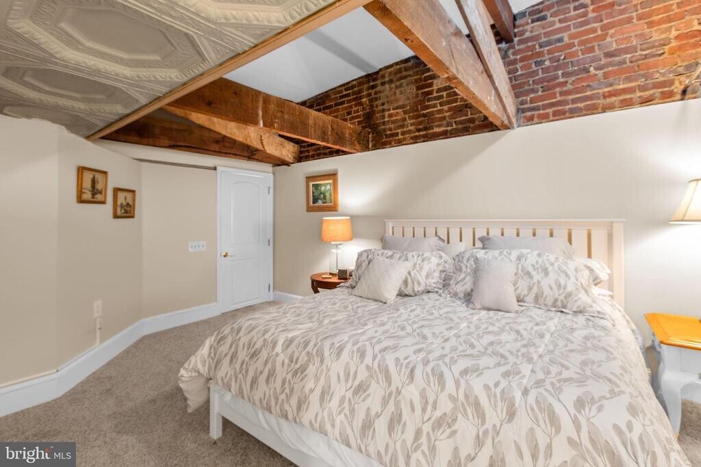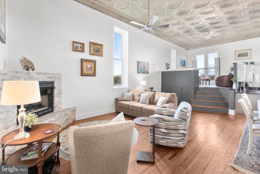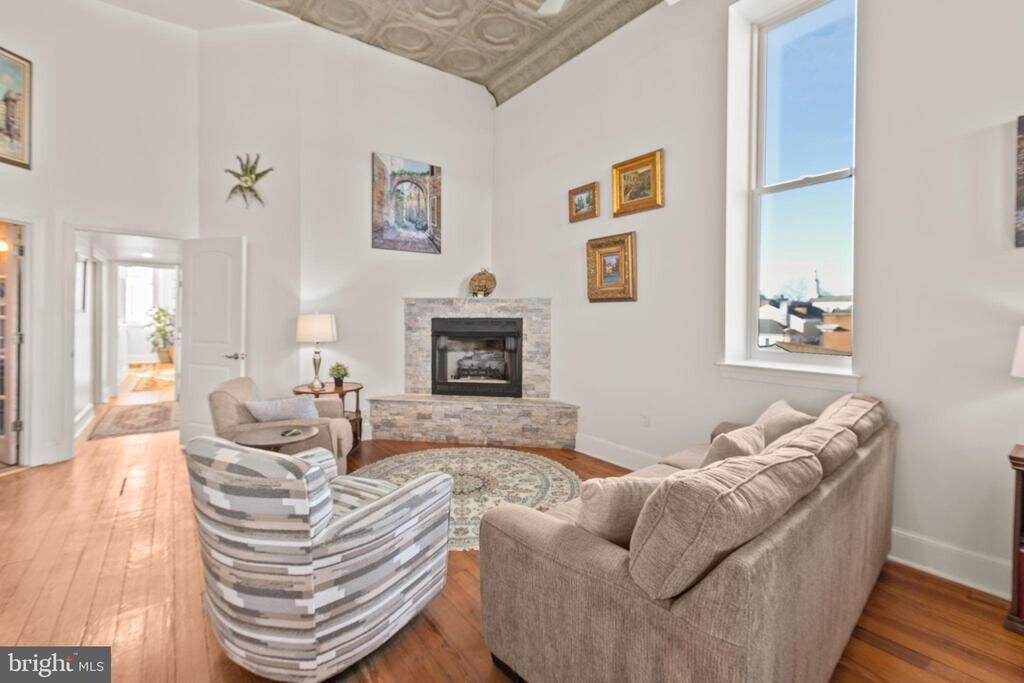 Live in the heart of Downtown Fredericksburg in this one-of-a-kind 2 bedroom, 2.5 bath penthouse located on the 3rd floor of a charming mixed-use building on Caroline Street. Full of character and space, this home blends historic charm with modern comfort in an unbeatable location close to dining, shopping, parks, and the Rappahannock River. Inside, you’ll find original tin-paneled high ceilings, exposed brick walls, wood beams, and huge windows that bring in great natural light. The layout is spacious and unique, with three separate living areas that offer plenty of room to spread out. Two living spaces include ventless gas fireplaces for added warmth and atmosphere. A third area features an elevated nook near the kitchen—perfect for extra seating, reading, or a creative workspace—and it leads directly to balcony access. Step outside to enjoy views overlooking Sophia Street, with the Rappahannock River visible in the distance. The primary suite is on the main level and includes a large bath with both a tub and a walk-in shower. A half bath is located off the kitchen, along with a stacked washer/dryer for convenience. The second bedroom is tucked away on the upper level and includes an ensuite full bath with a walk-in shower and a walk-in closet. This apartment is accessed by three flights of stairs (no elevator). Residents will enjoy one off-street parking space on the Sophia Street side of the building, plus additional public and paid parking options nearby. If you’ve been looking for a downtown rental with real personality, generous space, and great features, this penthouse is a must-see.