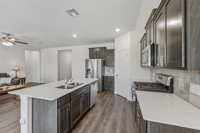 Well-maintained home located in the desirable Whitewing Trails community of Princeton. Welcoming stone-arched entryway and open floor plan ideal for entertaining. Luxury laminate flooring in main living areas, tile in bathrooms and utility room, and carpet in bedrooms and closets. The kitchen features a large island with quartz countertops, ample cabinetry, and pantry. Kitchen and garage refrigerators, washer, and dryer will remain with the property. Spacious primary suite includes a walk-in closet and dual sinks. Fenced backyard with wood fencing and wrought iron fence overlooking a walking path and green common area. Community amenities include a pool, playground, clubhouse, and walking trails through maintained green spaces. Conveniently located a short drive from Downtown McKinney. Real estate agents must attend showings.