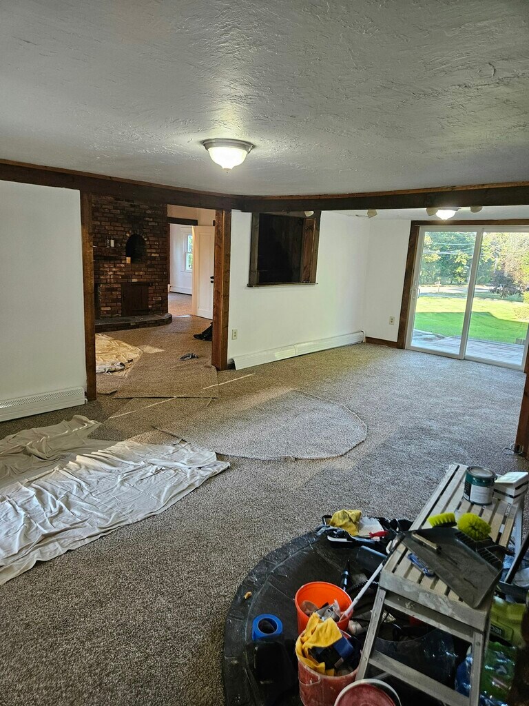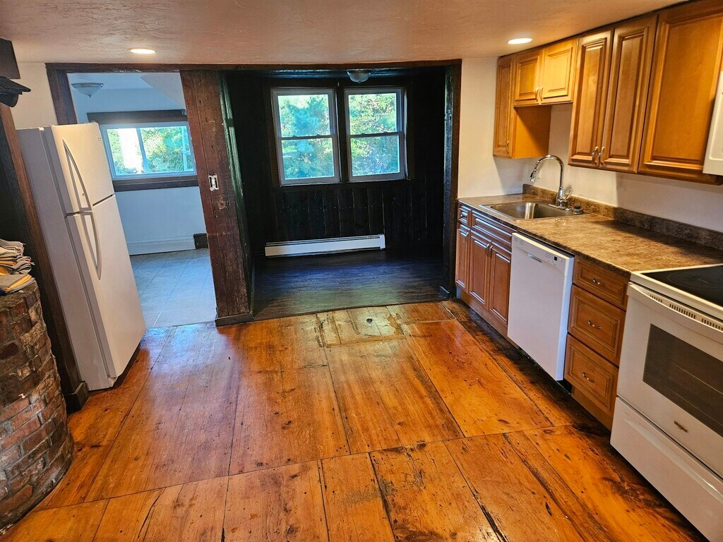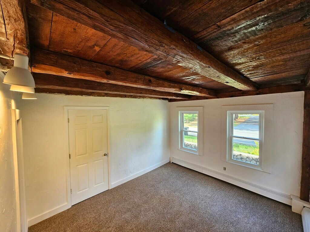 This 3 Bedroom apartment has had the following things done in prepration for listing: Freshly painted throughout entire apartment(ceiling, walls, trim, radiatiors etc). New Carpets installed throughout. Living room ceiling fan replaced Exterior patio renovated 1 bedroom has hardwood floors and walk in closet, Both other bedrooms have good sized closets, upstairs bedroom has built in drawer storage also. Kitchen has large plank antique hardwood floors. There is an office/large pantry type space off of the kitchen as well as an eat in kitchen area for small breakfast table. Bathroom and office areas off kitchen are vinyl plank flooring. There are 2 bedrooms on the first floor, each off of one of the living rooms and there is a bedroom up a set of stairs off of the living room on the second floor. This apartment has a double living room large decorative (non functional, will not be permitted to light fires) brick fireplace, antique post and beam living spaces, this house was built in the late 1700's, antique farm house look. There is a patio area accessible from a sliding glass door just off of one of the double living room areas. There is a covered wrap around front porch/patio area in front of this apartment. This apartment is on about 1.5 acres of shared land with a large grass side yard next to the patio for outdoor living/entertaining space tenant will have up to 3 parking spaces included, with more exterior storage if necessary available at additional cost. All of the windows are vinyl replacement double pane insulated windows. Heat is baseboard water by gas in basement Hot water is gas hot water tank in basement This is a non smoking apartment No Dogs, 1-2 cats with deposit other pets ask first Landlord manages landscaping, snow removal, water, septic maintenance. Tenants are responsible for gas bill, electric bill, trash removal and other utilities(internet, phone etc). First/Last Sec and background/credit screening required There is on site coin op laundry room across the hall from the kitchen door of this unit, tenants in this unit do not have to go outside to access the shared laundry room. Kitchen range is smooth top electric range, over the range microwave, refrigerator are provided. Due to septic/plumbing constraints there is no dishwasher in this unit. Please contact for walk through showing, right now unit is having new carpet installed, painting being redone, will be available October 1st, showings being conducted while renovation by appointment. This is a large apartment, with a private entrance from the front to the outside, not a shared entrance. 4 Minute drive to local commuter rail in Whitman, closet to Route 18, Tri Town Gas station area etc. please reach out with a cell phone number if possible, thank you.