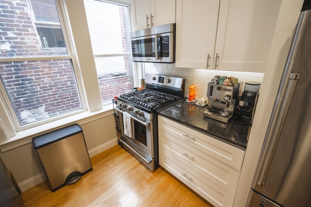 Welcome to the pinnacle of city living in this stunning 4-bedroom, 2-bathroom penthouse condo nestled in the vibrant heart of Boston's North End. Spanning an impressive 1100 square feet, this rare find is available for rent starting September 1st. Recently renovated, this top-floor unit boasts a modern kitchen equipped with stainless steel appliances, granite countertops, a tiled backsplash, and full-height shaker cabinets. The breakfast bar and open-concept floor plan create an inviting space for entertaining and everyday living. Each of the four bedrooms offers ample space and comfort, while the two full bathrooms add convenience. Hardwood floors, recessed lighting, and high ceilings throughout the unit contribute to a sense of luxury and refinement. Enhancing the convenience of this home is an in-unit washer and dryer, additional deeded storage in the basement, making this condo a perfect fit for modern city living. Located just steps away from the waterfront, Hanover Street, and public transportation, this condo offers easy access to I-93 and the best of Boston's dining, shopping, and entertainment. Experience the best of Boston living. Don't miss out on this incredible opportunity to call the North End home!