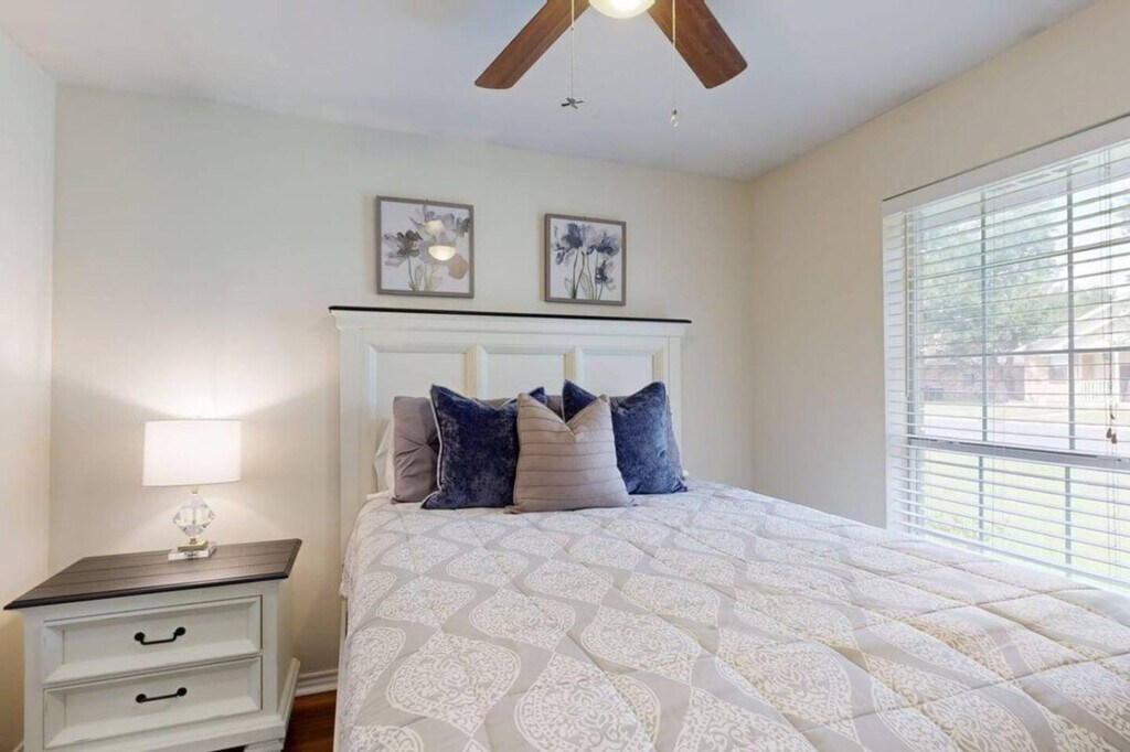 Feel at home in this stylish College Station retreat, just 3 miles from Texas A&M University and steps from Wolf Pen Creek Amphitheater. Perfect for game days, concerts, or exploring Aggieland, this professionally managed home blends comfort, convenience, and location in one charming package. This inviting home features vaulted ceilings and comfortable seating in the living room, creating a warm, welcoming space. The chef’s kitchen boasts leathered granite countertops, a tiled backsplash, and a large island ideal for meal prep or casual dining. The open living and dining areas are perfect for relaxing or entertaining. The kitchen is fully equipped for meals, snacks, and coffee breaks. This home welcomes up to two pets with an additional pet fee. Just blocks from Wolf Pen Creek Park and Amphitheater, this home is also minutes from Post Oak Mall, restaurants, and major roads. Enjoy a short walk to Wolf Pen Creek Park for trails, a playground, disc golf, and live entertainment. Texas A&M University is 3 miles away. The property may have one or more actively recording cameras overlooking the entrance, driveway, and backyard areas, which record audio and video. All devices are on the exterior of the property. Guests must be a minimum of 25 years or older to sign the booking agreement and be responsible for all guests in the party. [SI]