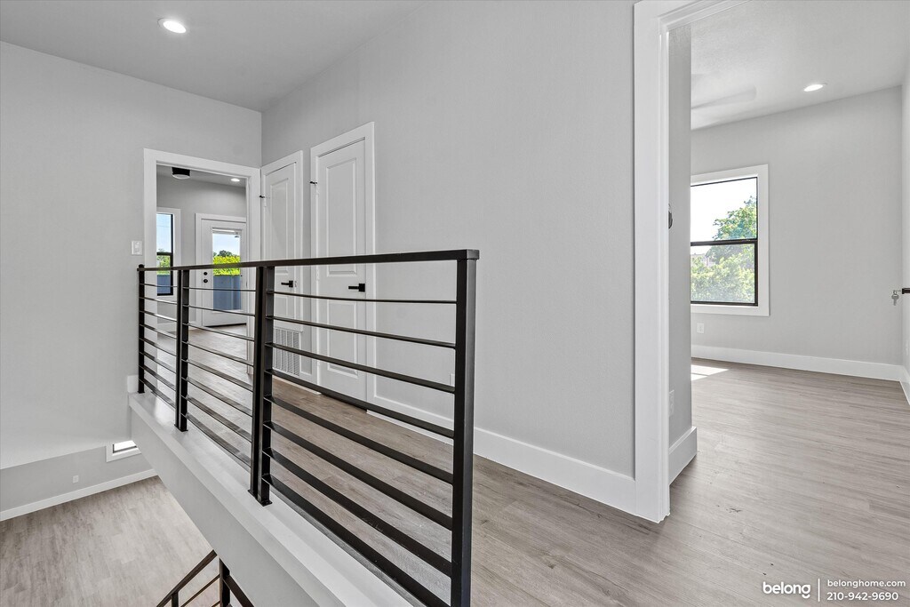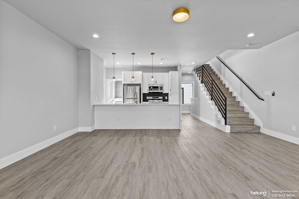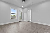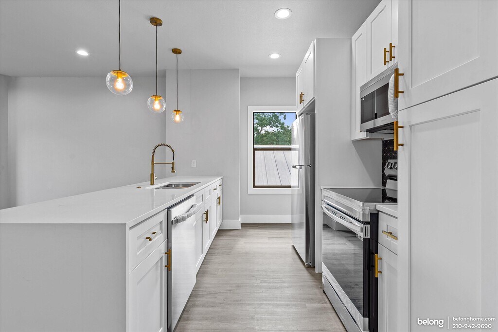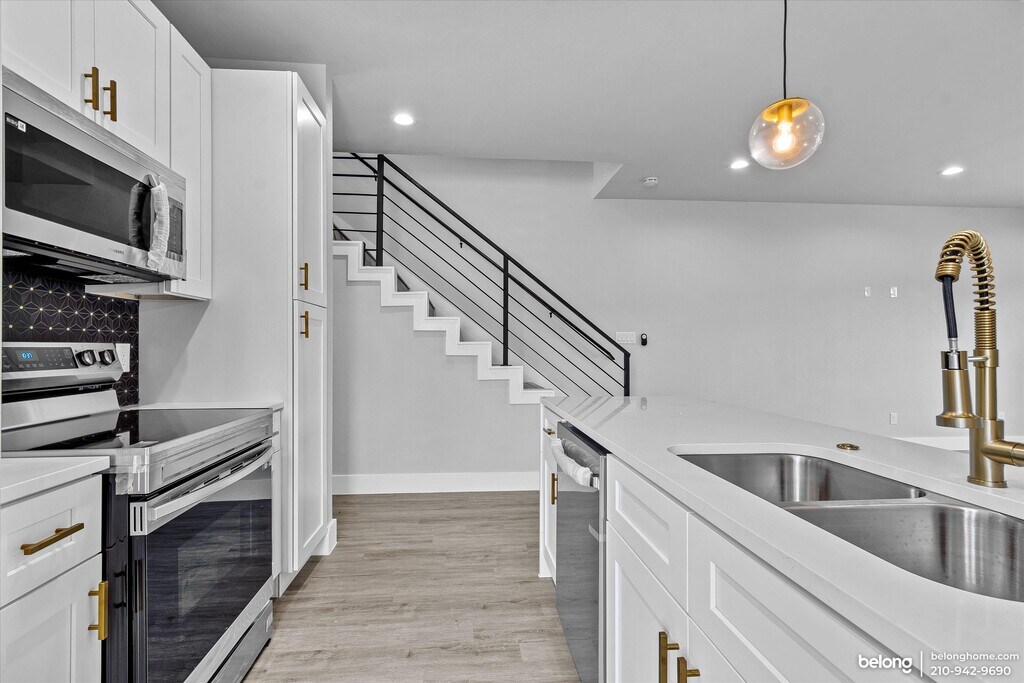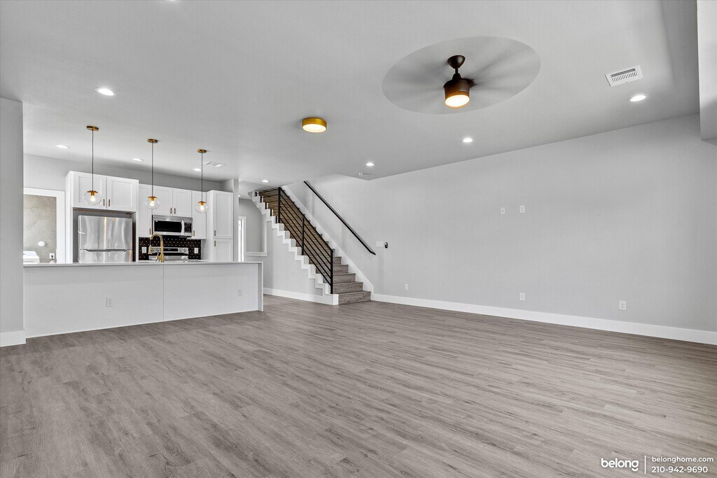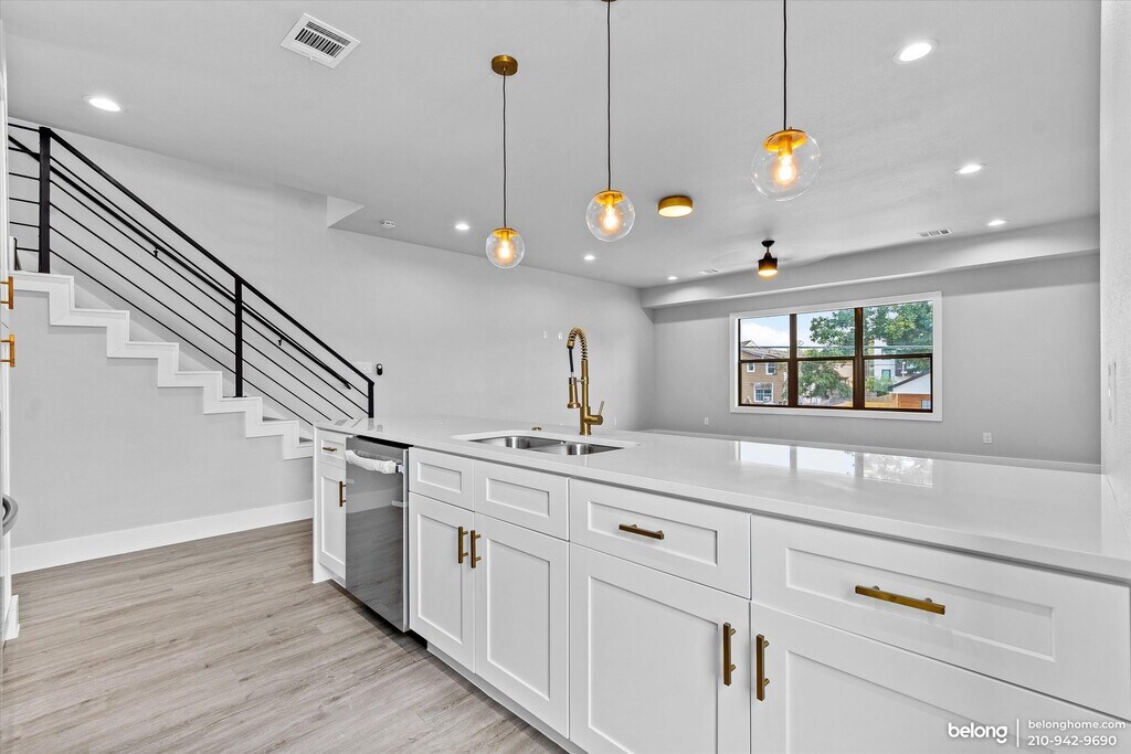 Step into the epitome of modern urban living with this exceptional 3-bedroom, 3.5-bath duplex. Every detail in this newly built home reflects a perfect blend of spaciousness and cozy charm. Abundant natural light enhances the open floor plan on the main floor, creating an ideal environment for gatherings. The kitchen is a standout feature, showcasing stainless steel appliances, sleek white countertops, and a striking kitchen island with pendant lighting. Ample storage ensures a clutter-free, functional, and stylish space. The three generously sized bedrooms provide ultimate comfort, with the primary suite as a highlight. This inviting retreat enjoys plentiful natural light, and the ensuite bathroom offers a luxurious walk-in shower and custom-built closets. The private balcony adds a special touch, providing a serene spot for morning coffee, evening relaxation, or yoga. Notably, pets are welcome here, making it a perfect home for your furry companions. Located just minutes from downtown and the Alamodome, this duplex offers chic urban living combined with the comfort and serenity of a well-designed home. Whether entertaining guests or enjoying quiet moments, this home offers an elevated lifestyle.