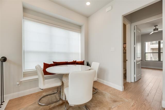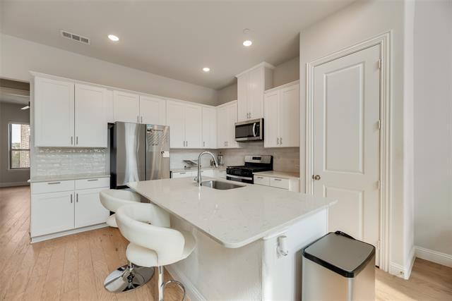 Beautiful three-story end-unit townhome in the heart of Frisco featuring an open-concept layout, engineered wood flooring, and abundant natural light. The main living area offers a sleek linear fireplace and flows into a modern kitchen with quartz countertops, stainless steel appliances, gas range, pantry, and a spacious island ideal for entertaining. The second level includes a private primary suite with walk-in closet, dual sinks, and separate shower, along with additional bedrooms for guests or office space. A versatile third-floor loft provides flexible living options. Complete with a covered balcony and rear-entry two-car attached garage, this low-maintenance home is conveniently located near shopping, dining, and major commuter routes. Lightly furnished. Anything you see in pics can stay.