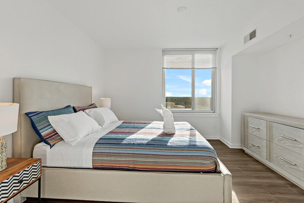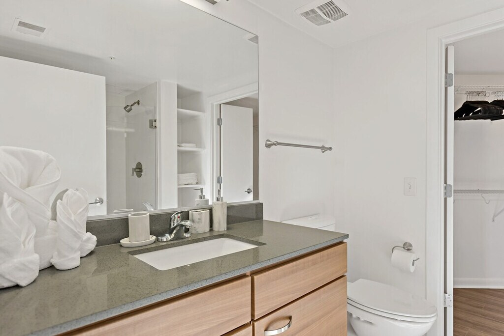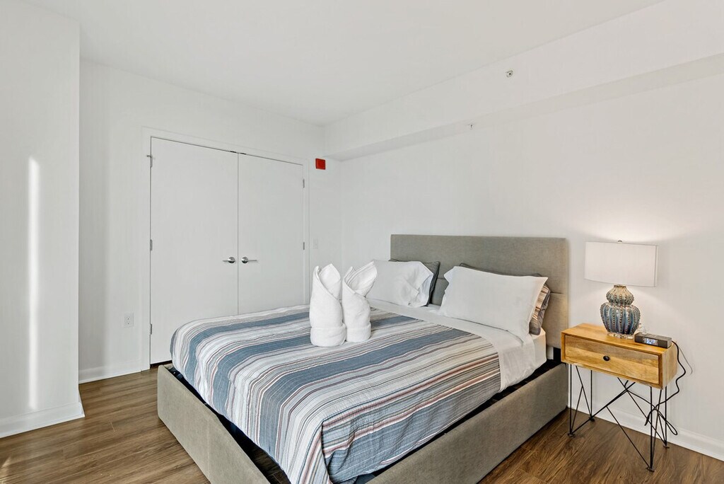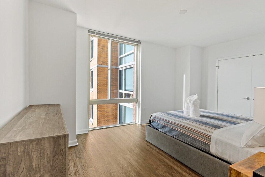 Feel at home in this bright 2-bedroom, 2-bath apartment in Tyson's, featuring sleek finishes, floor-to-ceiling windows, and city views. This apartment offers a full kitchen equipped with modern appliances, cookware, and utensils. The bedrooms feature plush queen beds with fresh linens and ample storage. The bathrooms include showers and fresh towels. The living room provides a warm and inviting space with comfortable seating and a cozy ambiance. Paid garage parking is available upon request, subject to availability, and must be arranged in advance. Public self-service parking is conveniently located across the street. Pets are allowed for an additional fee; please inquire for details. Located steps from Tyson's Corner Center’s shopping and the Silver Line Metro, this apartment is perfect for travelers seeking elegance and convenience, with easy access to D.C. in just 15 minutes. All guests are required to provide a valid government-issued ID to confirm their reservation. Building amenities include a fully equipped fitness center, an outdoor pool, communal outdoor dining areas, a remote work-friendly workspace and lounge, and a secure mail room. [SI]