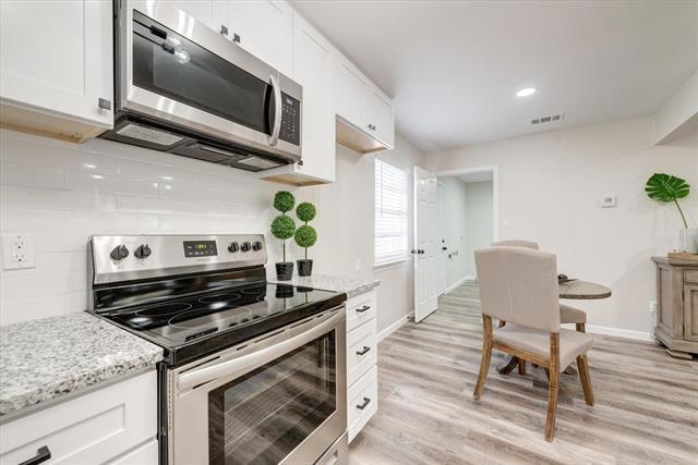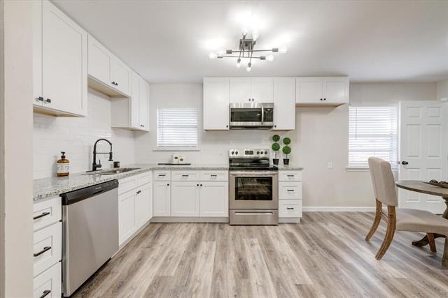 Very nice open concept 3 bedroom 1 bath fully renovated home in an established North Euless neighborhood. Recent updates include luxury vinyl plank floors, granite, cabinets, electrical, roof, carpet, stainless steel appliances, doors, LED lighting, oil rubbed bronze fixtures. Custom kitchen with soft close hinges and cabinets is a must see for any chef. Spa-like bathroom. Wood-burning fireplace. Separate utility room with washer and dryer hookup. Large backyard with additional 24x24 building. Pets considered on a case by case basis. NO SMOKING INSIDE. Renter insurance required. Prospective tenants over 18 are requested to submit an application using Rental Beast. Proof of very good rental history, work history and proven income of 3x rent.