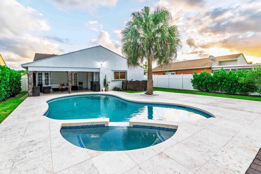 Courtesy of Atlantic One Realty Group LLC. Welcome to this private, resort-style single-family home located in desirable West Boca Raton. This spacious residence features three bedrooms, two bathrooms, a den, and an additional bonus room, providing flexible space for a home office, guest suite, or playroom. Step outside to your own private oasis featuring a pool and jacuzzi, perfect for relaxing or entertaining year-round. For added peace of mind, the home is equipped with accordion hurricane shutters and a storage shed for extra convenience. Please note that the garage has been converted and is available for storage only; however, ample driveway and street parking are provided. Benefit from a FAST HOA APPROVAL process, allowing for a quick move-in. Ideally situated near top-rated schools, premier shopping, dining, and major roadways, this home offers the perfect combination of privacy, space, and the Boca Raton lifestyle.