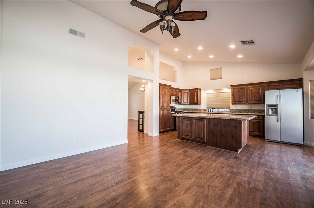 Single story 2 bedroom with den/office off living area featuring double doors. Laminate floors in living area. Living room/formal dining combination. Open kitchen features granite countertops and upgraded appliances. Large island for entertaining or casual dining. Family room off kitchen. Carpet in bedrooms. Large backyard. Easy care landscape. 3 car garage. Easy access to 215, Harry Reed Airport, and shopping.