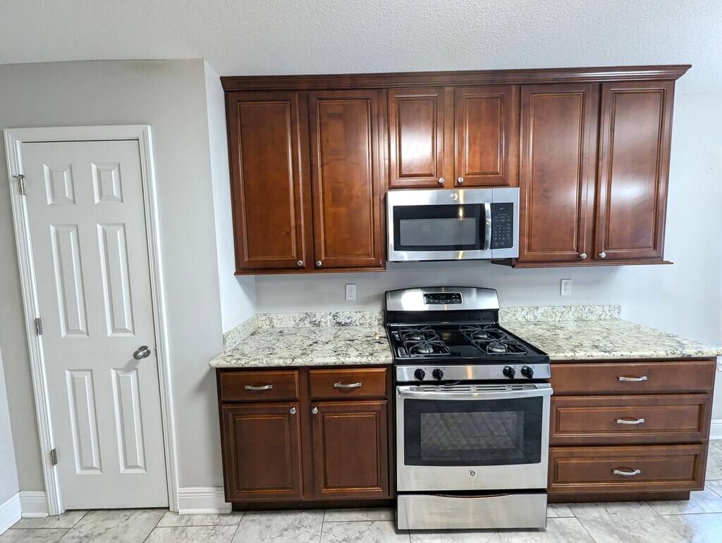 Welcome home to this beautifully designed brick home featuring granite countertops and custom cabinetry throughout! The chef's kitchen includes stainless steel appliances, a gas stove/oven, and a breakfast bar perfect for casual dining and entertaining.The oversized master suite offers private backyard access, a spacious walk-in closet with custom built-ins, and a luxurious en-suite bathroom featuring a custom-tiled shower and double vanity. Two additional bedrooms provide generous closet space and are conveniently located near the full guest bathroom.
