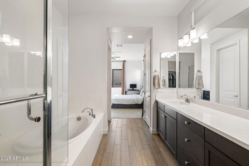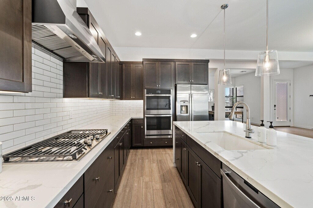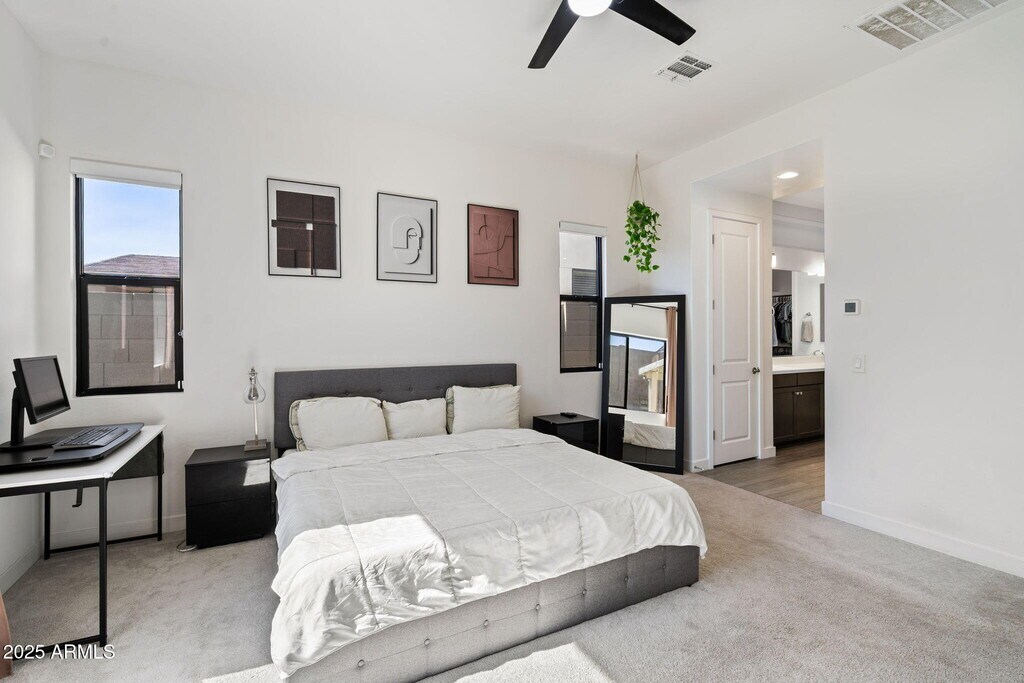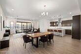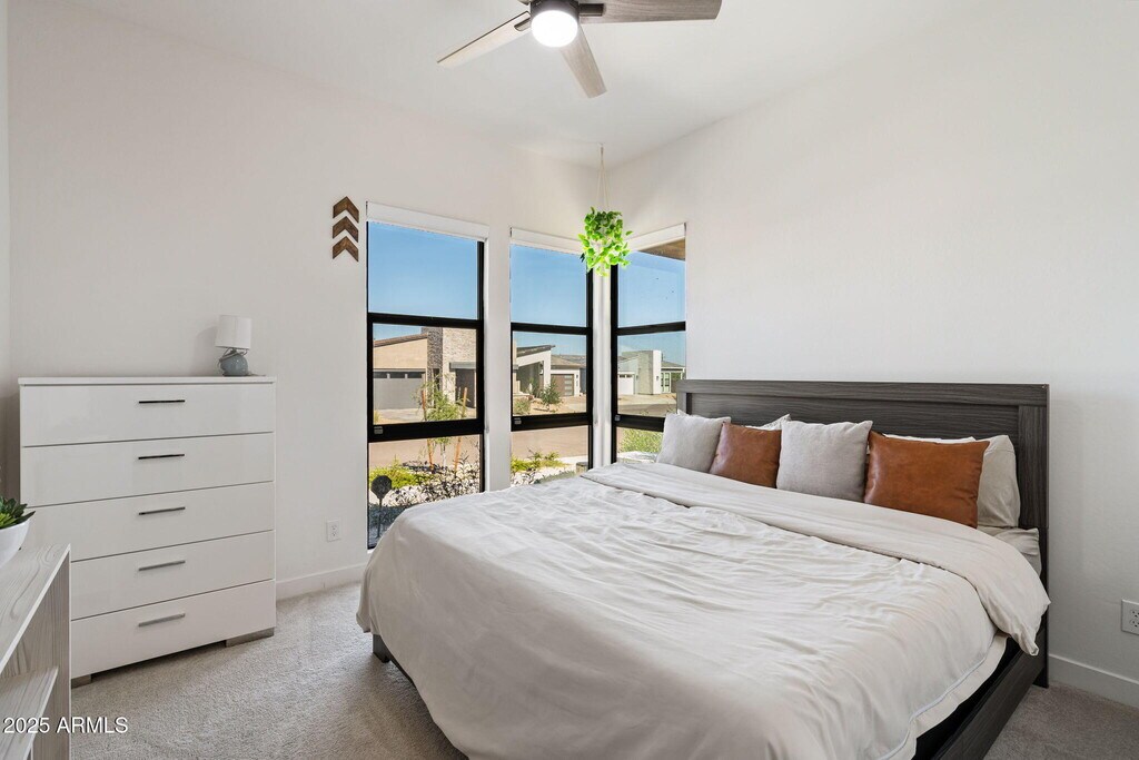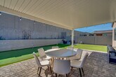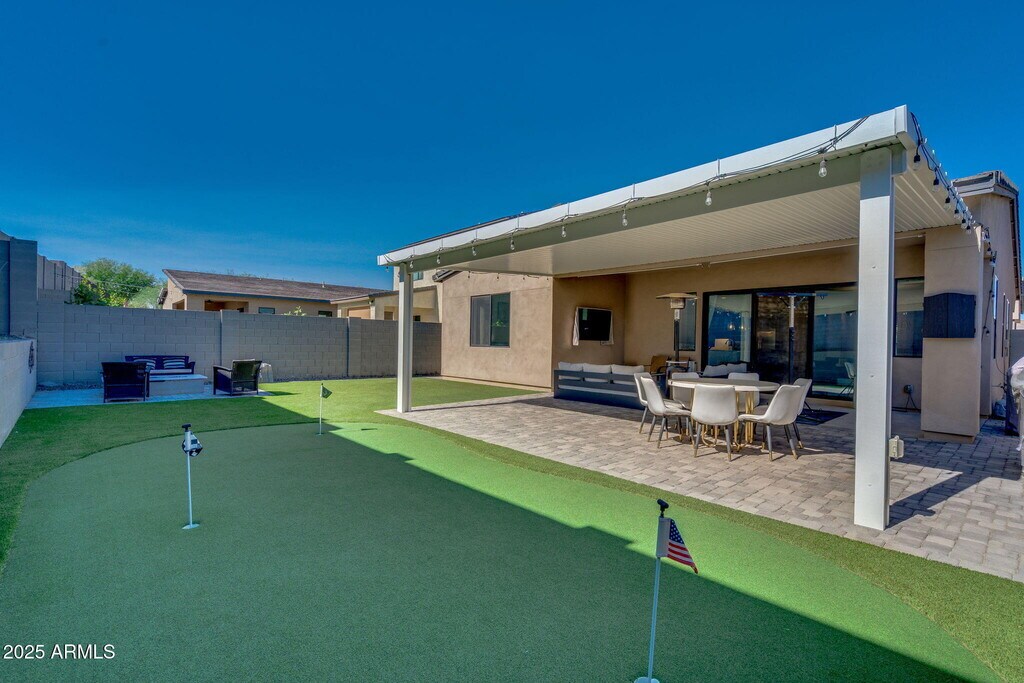 Welcome to this stunning home located in the highly sought after Avance community in South Mountain. This beautifully designed home offers modern living with thoughtful upgrades throughout. Step inside to find an open floor plan featuring wood-like tile flooring and ceiling fans in every room. The gorgeous chef's kitchen is the true centerpiece of the home,showcasing stainless steel appliances,a double oven,gas cooktop,quartz countertops,and a striking waterfall island,perfect for cooking,entertaining,or gathering with friends and family. The split-bedroom layout provides added privacy for all. The spacious primary suite is tucked away for comfort,while one of the secondary bedrooms includes its own full bathroom ideal for guests,roommates,or multigenerational living. The backyard is an entertainer's dream,featuring an extended patio cover with a paver design,a gas fireplace,synthetic grass for easy maintenance,and a custom putting green. Enjoy resort-style amenities within the Avance community,including a sparkling pool,relaxing spa,and fully equipped gym. A must-see!