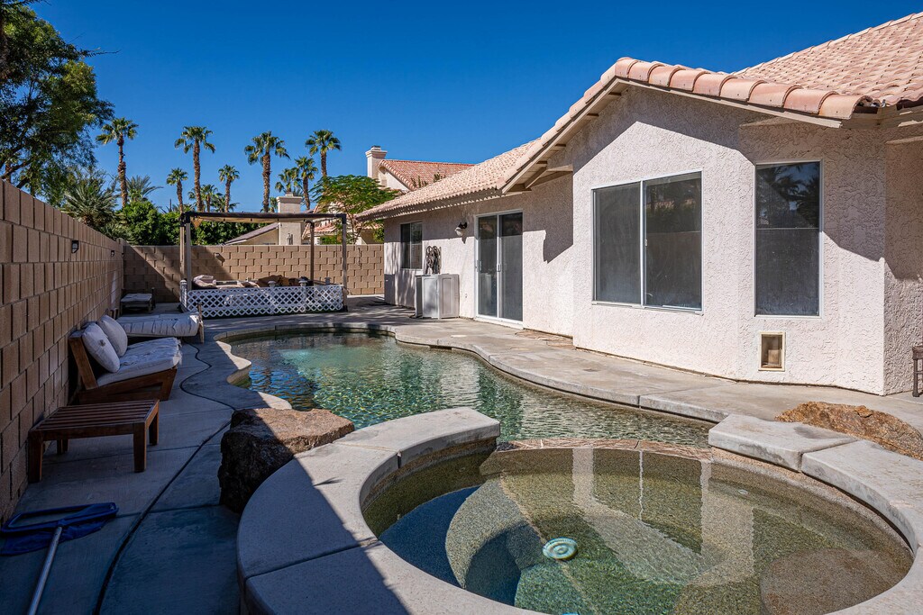 Freshly painted 4 bedroom,2 bath family home with pool/jacuzzi. 3 car garage with kitchen access. Recently remodeled kitchen complete with new appliances - refrigerator,microwave,stove and dishwasher. Newly built side bar area near indoor fireplace,also recently remodeled with new facade. New laminate flooring and high ceilings throughout. Master bedroom with walk-in in closet,sliding door access to backyard and en suite bathroom with dual head shower. 2 additional rooms with walk-in closets and third room with large front bay window. Guest bath remodeled and repainted complete with bathtub and shower. Backyard with pool and jacuzzi as well as covered patio area. Located in Indio near the Empire Polo fields and La Quinta border. On a cul de sac street with a community park at the end of the street. Short driving distance to major shopping areas and grocery stores. *Photos show house as furnished but will be rented as unfurnished* One year lease preferred. Renter will be subject to background,credit and reference check. Small pets allowed with additional pet deposit. Renter is responsible for all utilities (water,electric and gas). Owner pays for pool and gardening services weekly.