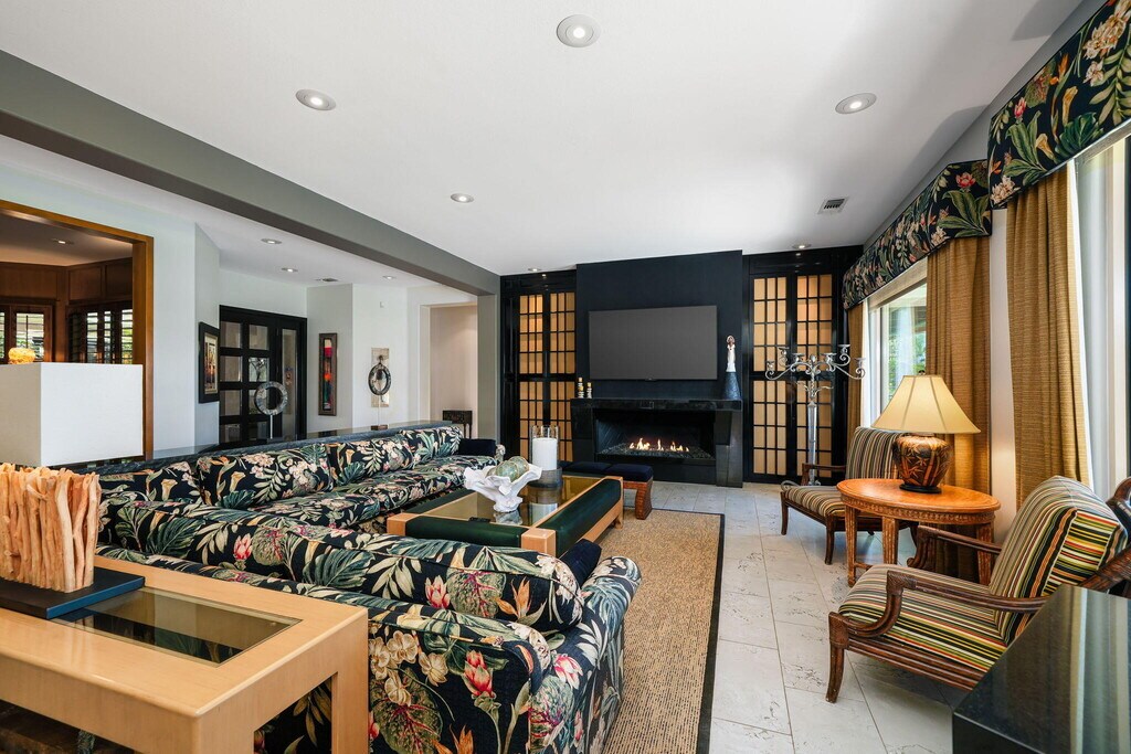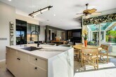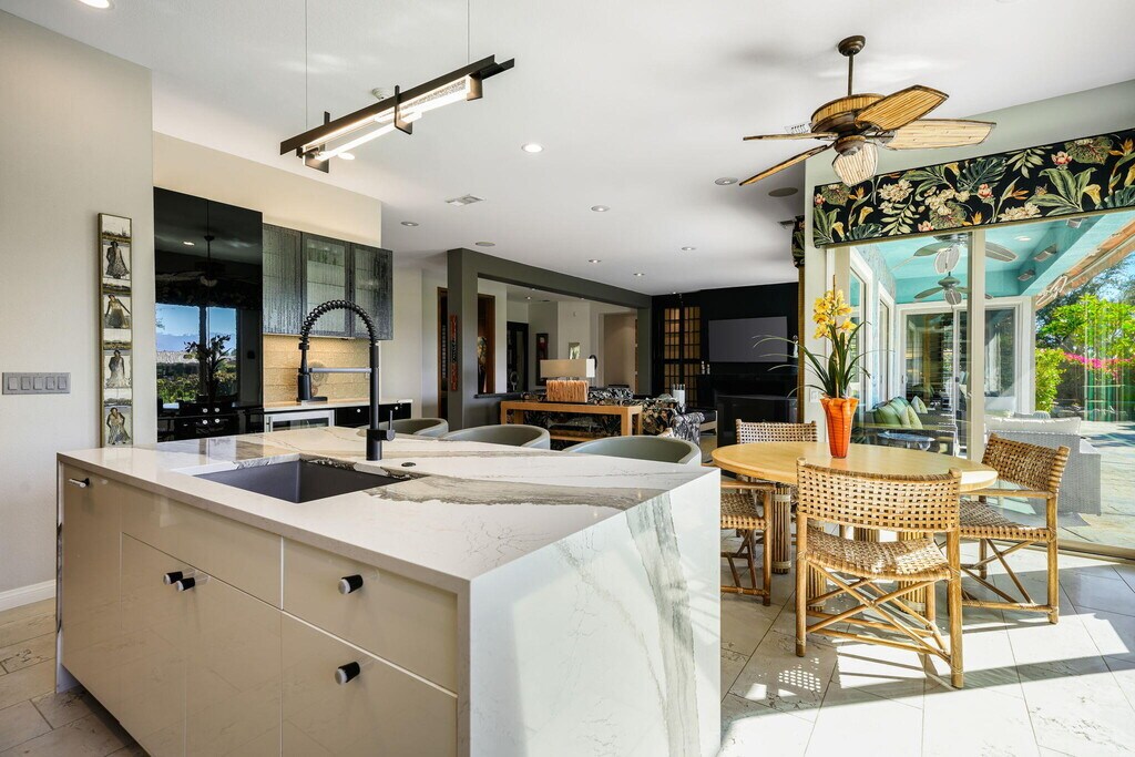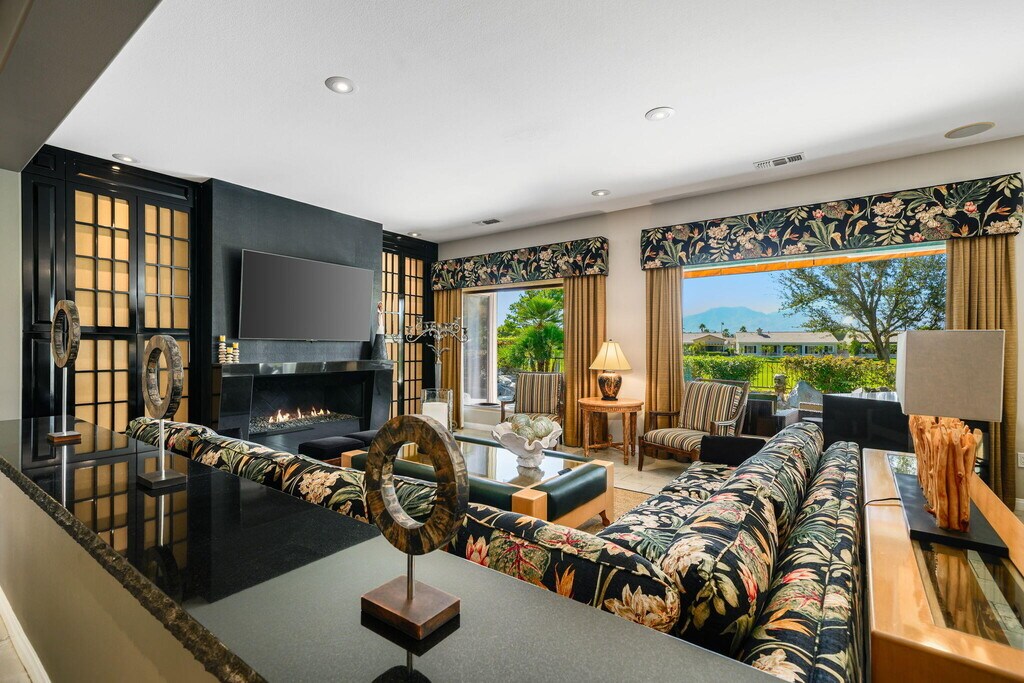 Discover this breathtaking tropical retreat in Del Webb's guard-gated Sun City Shadow Hills active adult community near Palm Springs,CA. This reimagined 3 BR La Paz floor plan features nearly 3,000 SF and sits south-facing on it's championship golf course,offering panoramic mountain and fairway views that define desert luxury living. Originally built in 2006 and transformed through a million-dollar designer renovation,this residence blends sophisticated design with relaxed island elegance. A custom wrought iron entry gate opens to a lush,tropical courtyard featuring a soothing rock water feature and access to a private Guest Casita. Inside the main residence,a custom solid wood and glass entry door reveals an interior of natural textures,warm wood tones,and curated finishes inspired by tropical resort living. The great room showcases expansive picture windows and mesmerizing views of the sparkling pool,golf course and Santa Rosa mountains. A dramatic black granite fireplace with floor-to-ceiling cabinetry anchors the living space,which flows seamlessly into the formal island-inspired dining area and sophisticated kitchen remodel,creating a perfect setting for entertaining. A richly appointed den features custom wood paneling,built-in cabinetry,shutters,and bamboo flooring,offering a cozy retreat for work or relaxation. The primary suite provides a luxurious spa-like retreat with impeccable custom designer touches throughout. Outdoors,experience the ultimate in desert resort living. A sparkling pool with three cascading waterfalls,and separate spa,form the centerpiece of the lushly landscaped backyard oasis,complemented by a lava rock firepit and expansive patio areas ideal for lounging or alfresco diningthe covered patio is highlighted by a custom mosaic wall by revered beach city artist and is framed by southern mountain vistas and glowing desert sunsets. Available to discriminating buyers and offered FOR SALE or SEASONAL LEASE,this exceptional home offers the pinnacle of luxury desert living within one of the Coachella Valley's most sought-after active adult golf communitiesjust minutes from Palm Springs,world-class shopping,dining,and entertainment.