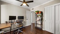 Audra SotoMUST SEE townhome facing the greenbelt with tasteful custom details throughout. Lower-level features treated concrete floors, plantation wood shutters, wainscoting paneling, crown molding, and custom woodwork in a nicely sized living room. The quaint kitchen includes stylish cabinetry, black backsplash, and granite countertops. Upstairs offers engineered wood flooring, a spacious primary bedroom with walk-in closet, built-in cabinetry, and barn door. Custom walnut staircase adds a distinctive architectural touch. Bathrooms are quaint and well-appointed. Enjoy a fenced private patio with pavers, ideal for outdoor relaxation. Spacious private laundry room with additional storage. Conveniently located near the up-and-coming Metrocenter redevelopment, of the new ''The Metropolitan'