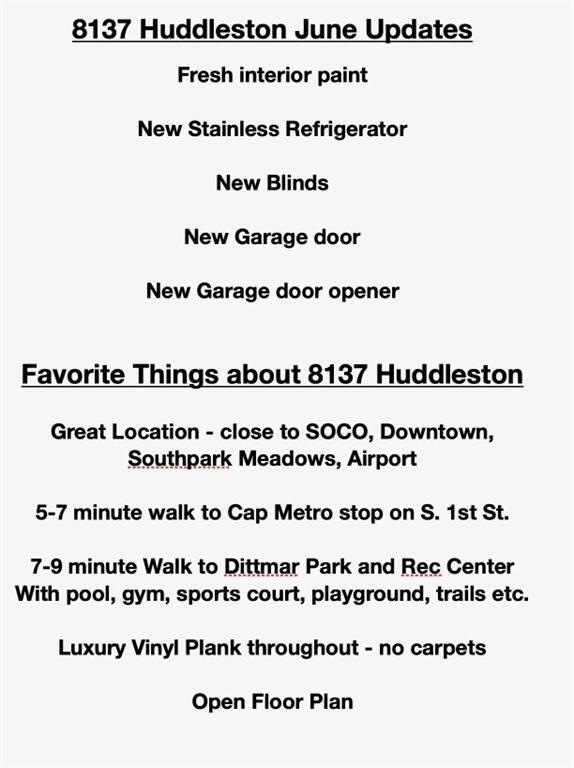 Welcome to 8137 Huddleston Lane in South Austin! This charming 3-Bedroom/2-bath house has a great South Austin location, with easy access to local schools, Dittmar Park & Rec Center and Southpark Meadows. The open floorplan, freshly painted interior and vinyl plank flooring throughout makes this home welcoming, low maintenance and perfect for entertaining. The spacious primary suite, cozy fireplace, covered patio and private fenced yard provide a relaxing oasis to unwind. Enjoy the convenience of an indoor utility room and two car attached garge. Small dogs negotiable with additional deposits and fees. Ready for move in ASAP. Don't miss out on this opportunity to call this lovely house your home!