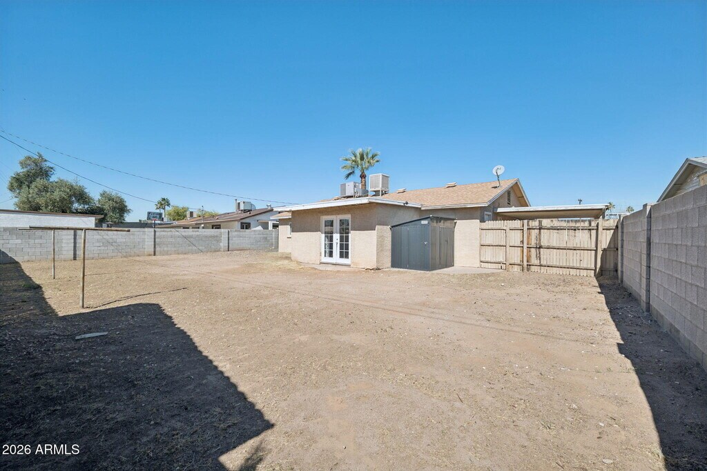 Nicely freshened up 3bed/2bath (plus bonus den / office),single story home on large lot is available now! Step in to greatroom floorplan w/ open kitchen,complete with granite countertops and all appliances. Entrances from both front and carport for easy access. Den / office off of living room,perfect for playroom or home office. Large laundry room- washer & dryer included! Updated bathrooms. New carpet in all bedrooms. Ceiling fans throughout. Carport,slab and street parking for plenty of space. Grass yard out front,large,dirt yard out back- perfect clean slate! Storage shed AND storage room out back. Great location is central to Loop 101,I-10,bus stops,groceries,parks and more!