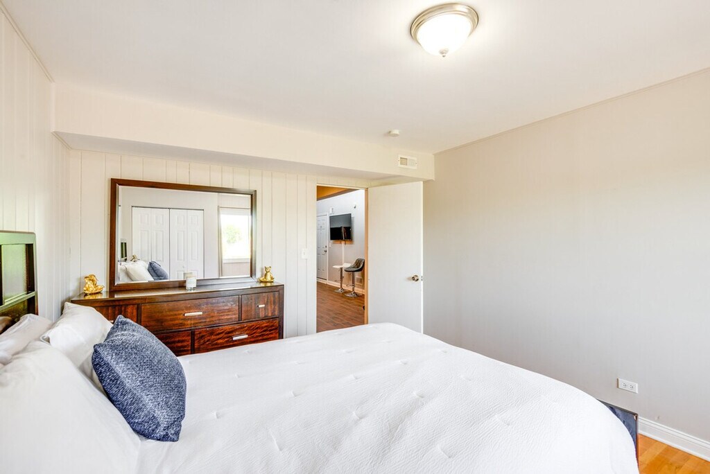 Heading to Chicago for work? This Ashburn vacation rental keeps things simple and convenient. The 2-bedroom, 1-bath apartment offers a full kitchen, lounge space, and easy access to public transportation, The Loop, and top attractions. In your downtime, head to the lakeshore for some fresh air and relaxation — less than 10 miles away — or visit top-tier restaurants in nearby Hyde Park. This single-story apartment is on the building's 2nd floor and requires stairs for entry. The apartment features a comfortable lounge space with a smart TV and a covered balcony, perfect for unwinding after a busy day. The fully equipped kitchen includes a refrigerator, stove, oven, dishwasher, Keurig, blender, toaster, microwave, cooking basics, dishware, and flatware, along with bar seating for casual dining. Free street parking is available on a first-come, first-served basis. Additional accommodations are available on-site with a separate nightly rate. Inquire for more information if you wish to reserve both rentals. Located on a main road in a residential area, this apartment offers the convenience of walking to the train, bus, and grocery store. It is just 10 miles from the Illinois Medical District, providing easy access to The Loop and top attractions in Chicago. The apartment has a no-smoking and no-pets policy, and no events, parties, or large gatherings are allowed. Guests must be at least 21 years old to book. Access to the property is via keyless entry, and a photo ID may be required upon check-in. Additional fees and taxes may apply. There is another bookable vacation rental on-site, so other travelers may be present during your stay. Inquire with the Guest Contact for information about using the community gym and available fitness classes. The apartment offers free WiFi, making it easy to stay connected for work or leisure. [SI]