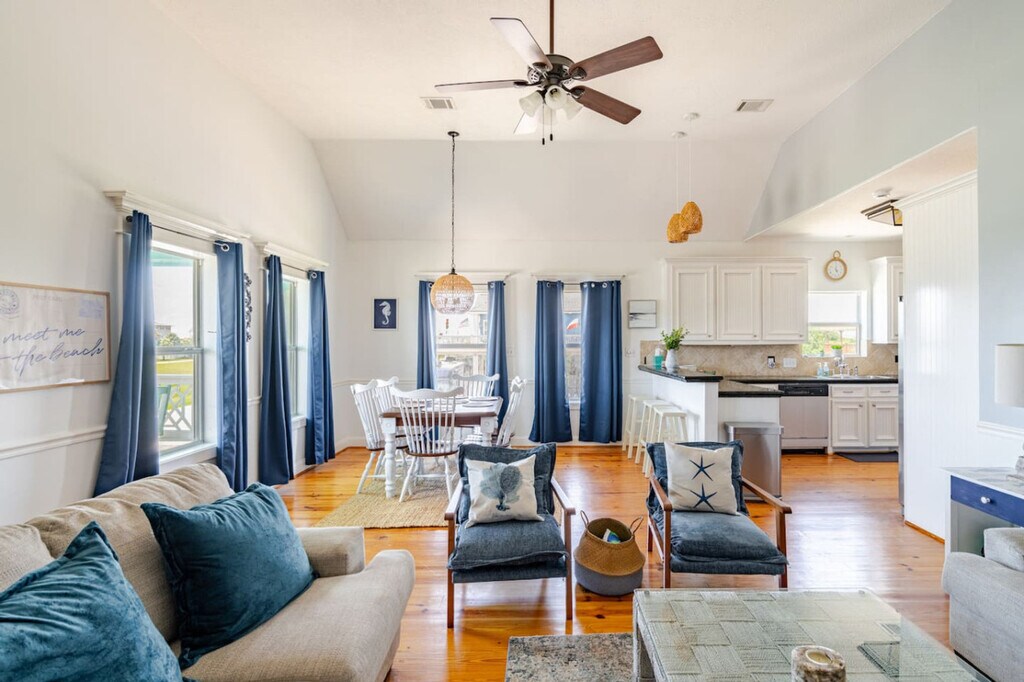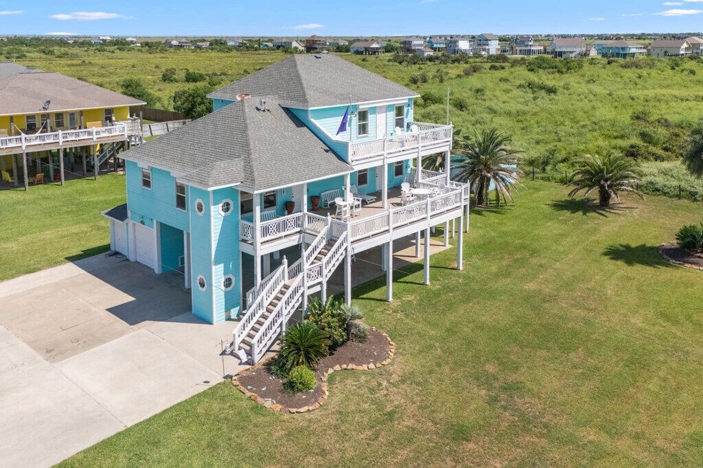 Experience the ultimate retreat in this spacious 6-bedroom home spread across three levels, perfect for accommodating up to 15 guests. Located just a 30-second drive from the beach, this property offers stunning views, a large deck, a tiki bar, and an outdoor shower. The home features three king bedrooms, a room with two twin beds, one queen bedroom, a separate bunk room, and two living rooms, providing ample space for relaxation after a day in the sun. Step inside to find a welcoming main level featuring a comfortable living room, a fully equipped kitchen, and a bright dining area. The master suite includes a king-size bed, an attached bath, and plenty of natural light. A second bedroom with a queen bed and an additional bathroom are also on this level. Upstairs, a second living room invites relaxation, accompanied by two more bedrooms with king-size beds and a cozy twin-bed room. On the lower patio level, discover a bunk room with a bunk bed and a full-size bed, plus a shaded seating area and a lively tiki bar, perfect for afternoons and evenings outdoors. Guests can purchase a variety of add-ons through the portal, including early check-in, late check-out, and additional services to enhance their stay. This stretch of the Bolivar Peninsula offers wide-open beaches, gentle Gulf breezes, and panoramic water views. Known for its laid-back, walkable vibe, the area features homes often nestled on stilts above low-lying dunes for that classic coastal look. Daily life here moves at the pace of the tide, with serene shoreline walks, local fishing piers, and historic spots like Fort Travis Seashore Park and the Bolivar Lighthouse nearby. Port Bolivar sits just across from Galveston Island, accessible via a scenic ferry ride, making it both accessible and wonderfully removed. Driving is the most common way to navigate the peninsula, but golf carts are also a fun and practical choice for getting around locally. The master closet is reserved for the homeowner’s personal items and cleaner’s storage. Limited garage access is available for certain items such as the grill. A $300 security deposit pre-authorization hold is required, placed 3 days before check-in and released 4 days after check-out, provided there’s no damage. Large gatherings, loud parties, and unauthorized events are not allowed, and only registered guests are permitted unless otherwise approved. Smoking is prohibited inside the house, and if smoking outside, cigarette butts must be properly disposed of. Quiet hours are from 11 PM to 8 AM to avoid disturbing neighbors. Parking is allowed only in designated areas, and beach etiquette requires rinsing off sand before entering the house and following local beach rules. Unauthorized late check-outs may result in an additional fee. Adhere to local beach rules and safety regulations. Do not touch the switches labeled 'leave in the middle' as they operate the hurricane shutters and can be damaged if moved. [SI]