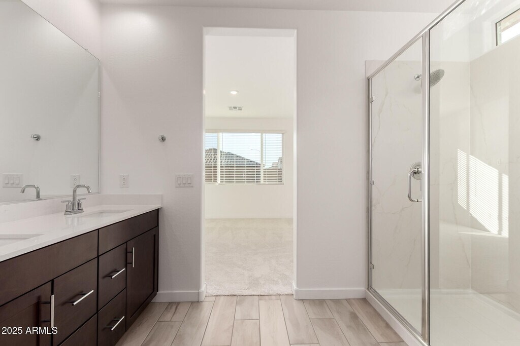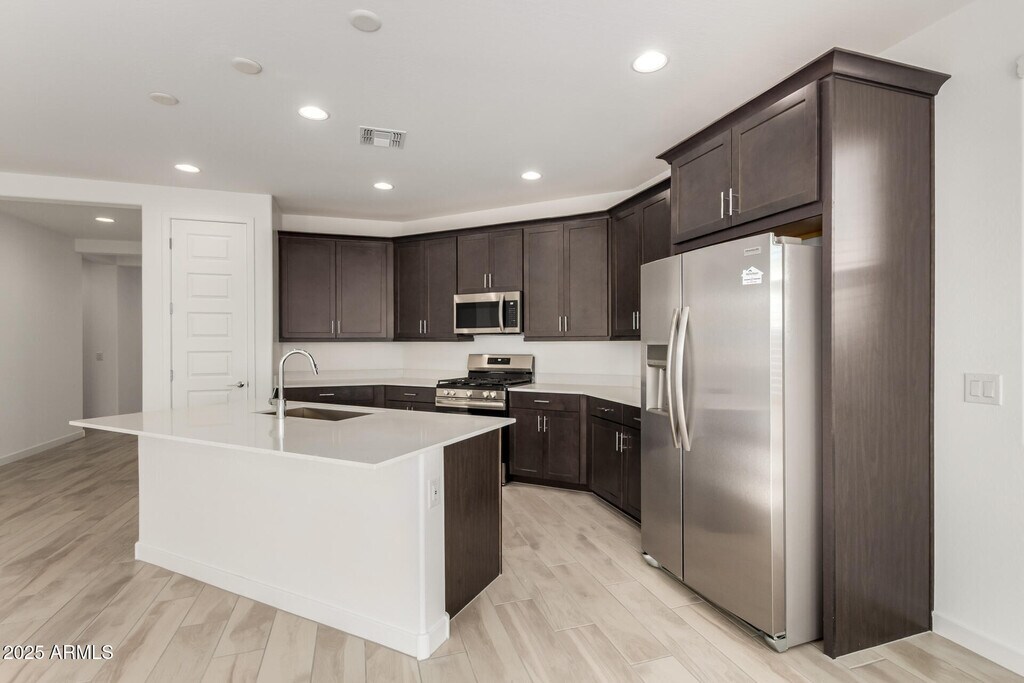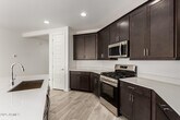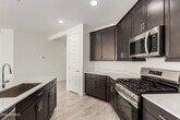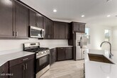 This brand-new Sage model in Hawes Crossing offers modern living with comfort and style in one of Mesa's most exciting new communities! Featuring 4 bedrooms,3 bathrooms,and a versatile den,this single-level home has a bright open layout with espresso colored cabinets,white quartz counters,and wood-look tile floors throughout. The kitchen is a showstopper with stainless steel appliances,a gas range,and a spacious pantryperfect for cooking,entertaining,or gathering with friends. The primary suite includes dual sinks,and a sleek walk-in shower,while two bedrooms share a convenient Jack-and-Jill bath and another full bath offers extra flexibility. Step outside to your private backyard with lush turf,pavers,and desert landscaping,designed for easy care and year-round enjoyment. With smart home features,an EV charging outlet,washer and dryer,and high-speed internet included,every detail is designed for modern convenience. Located just minutes from shopping,dining,and Loop 202,Hawes Crossing brings resort-style living to your doorstep with a sparkling pool,pickleball and basketball courts,playgrounds,picnic areas,dog park,and vibrant community energy - you'll love calling this place home! (Backyard landscape will be installed. Tenant may need to cooperate with contractor after move-in.)