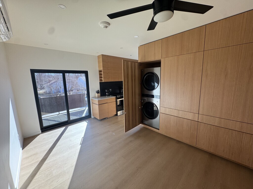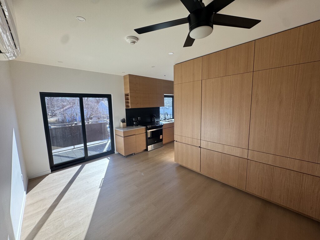 Second floor, energy efficient studio unit in a new condo building available NOW. This second floor unit features custom cabinetry, quartz countertops, high ceilings, and a queen sized murphy bed (with mattress). The building security includes locked entrances, security cameras, and secure parking area with EV chargers (coming soon). The building also features a common room that can be reserved for game nights or days, or other small events. The common room has a kitchenette with a beverage fridge and ice maker as well as an ADA accessible bathroom.