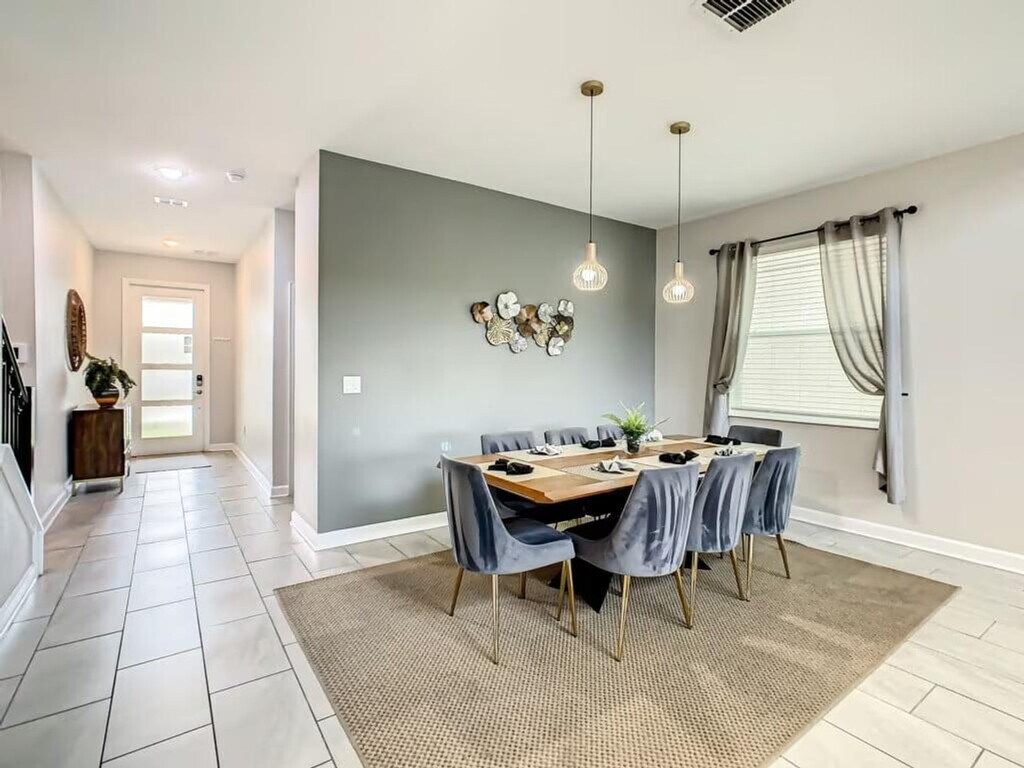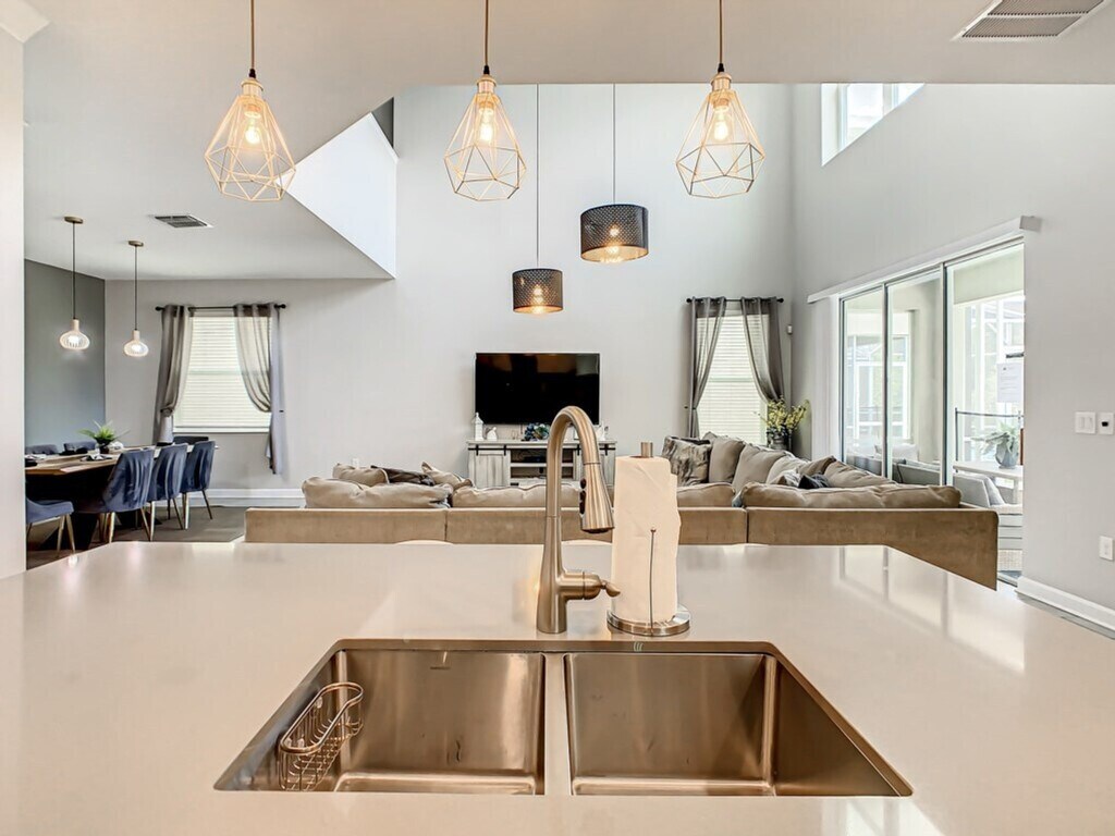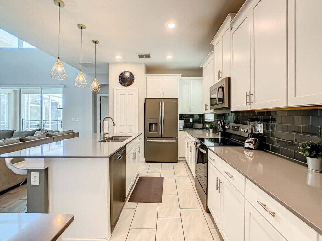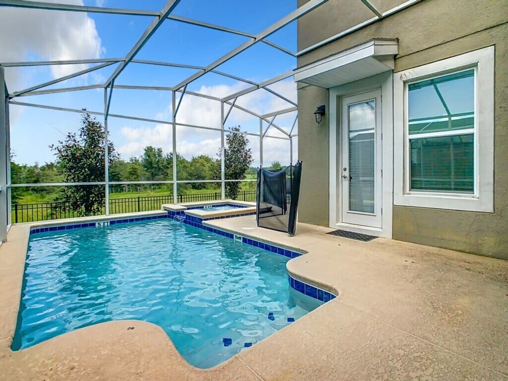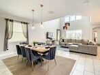 Welcome to Cabot Cliff Memories, a luxurious 5-bedroom, 5-bath villa located in the world-renowned Champions Gate Golf Community. With room for 10 guests, this sunlit home offers themed bedrooms, a private pool and spa, and a fully equipped kitchen. Enjoy the nearby major theme parks, including Disney just 20 minutes away, or relax at the Oasis Clubhouse with its lazy river, fitness center, and tiki bar. Perfect for families and groups, your unforgettable vacation starts here! Relax in the spacious living room with a large sectional, perfect for family time. The open-plan layout includes an 8-seat dining table and a 4-seat breakfast bar, ideal for group meals or midnight snacks. The kitchen is fully equipped with modern appliances, a large island, and all the tools needed to prepare delicious meals during your stay. The upstairs loft offers a sectional couch and a large flat-screen TV, perfect for movie nights or binge-watching your favorite shows. Step outside to your private screened pool and spillover spa, complete with outdoor furniture and lounge chairs. Optional pool heating is available for an additional fee. Driveway parking is available for 1 car. Located just 20 minutes from Disney and close to Universal Studios, SeaWorld, and other attractions. Champions Gate also offers local dining, shopping, and entertainment options. No pets, parties, or outside visitors allowed. Check-in is at 4 PM and check-out is at 10 AM. Driveway parking is available for 1 car and there is no street parking. As a guest of the Champions Gate community, enjoy access to the Oasis Clubhouse, featuring a resort-style pool, lazy river, splash park, tiki bar, fitness center, and even a movie theater. Golf enthusiasts will love the two Greg Norman-designed golf courses.