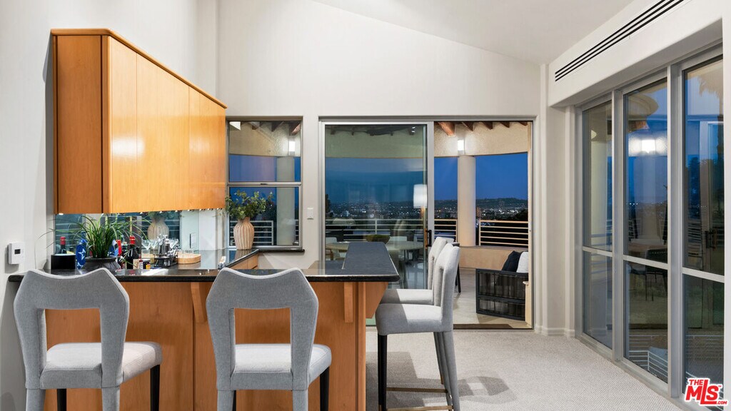 First time on the market since built by engineer for his own family! Beautifully sited on a quiet cul-de-sac north of Sunset in prime Beverly Hills, this gated contemporary masterpiece drawing inspiration from master architect Richard Meier and the iconic Hotel del Coronado, offers approximately 9,525 square feet of refined architectural living (including car lover's garage/lounge and bonus spaces/ approx. 1,700 sq ft. of viewing decks). Recently reimagined renovation, the residence blends modern architecture with timeless craftsmanship, designed for the ultimate indoor/outdoor California lifestyle. A dramatic glass and stone entry with sweeping spiral staircase sets the tone, while soaring ceilings and expansive windows frame unobstructed views stretching from Downtown to Palos Verdes without a lengthy hilltop drive. Natural stone finishes, a full-service elevator, custom cabinetry, and abundant natural light create a warm yet sophisticated backdrop throughout. The private first floor primary suite is a sanctuary, complete with two full spa-like bathroom suites featuring a cedar sauna, Jacuzzi, walk-in stone shower, and oversized dual dressing rooms with bar sink and refrigerator. This hotel-like primary was designed with low decks overlooking the pool and immediate access for a morning swim. Two additional en suite bedrooms on the first floor are perfect for guests or dual offices. Staff room on main floor designed with immediate access to the kitchen and entertaining areas while maintaining privacy for the primary main floor wing. On the upper floor at the heart of the home, a gourmet chef's kitchen boasts a Viking range, dual Sub-Zero refrigerators, wine storage, and a large bright breakfast room opening to an outdoor living room. Formal and informal dining spaces flow seamlessly to a covered outdoor terrace, perfect for entertaining with views of Century City and Downtown. The lower level is dedicated to entertainment with a full-floor recreation space which could be used for a gym, media lounge, pool table, secondary kitchen, full bath and private entry, ideal for guests or multi-generational living. A 500+ bottle wine cellar, wet bar, and multiple fireplaces enhance the lifestyle. Outside, lush landscaped grounds unfold around a dark-bottom infinity pool, dual spas (one a walk-in perfect for a cold plunge), sport court, rose garden, and citrus orchard. Mature palms, expansive lawns, and dramatic nighttime lighting complete the resort-like setting. Additional highlights include a dumb waiter servicing all levels, 5-zone HVAC, central vacuum, security system, commercial backup generator, and an 5-car collector's garage with additional motor court parking. MLS# 26661287