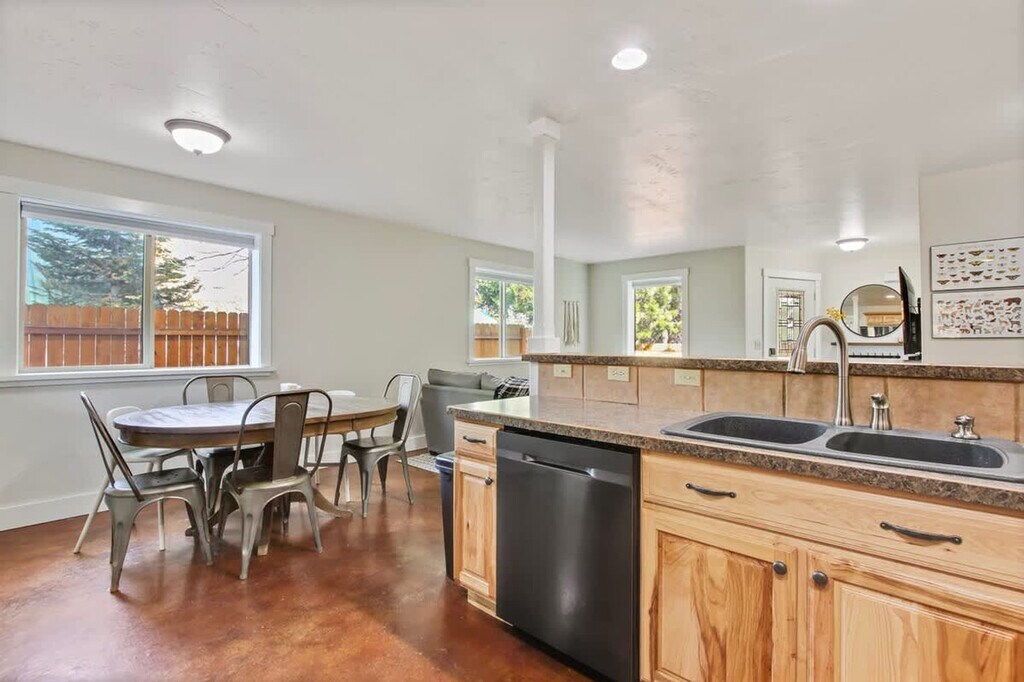 Feel at home in this private oasis in McCall, Idaho, ideally located a short walk to Payette Lake, Legacy Park Beach, Brown Park, and downtown shops. This home features a large deck that wraps around the entire side and back. Enjoy a barbecue on the back deck or sit by the gas fire pit in the evening. Relax in the hot tub after a day of hiking, boating, or snowboarding. The brand-new black stainless steel appliances and fully stocked kitchen will meet every home chef's needs. The kitchen comes with oils, spices, seasonings, and some basic baking essentials. A new wine/beverage fridge keeps bottles chilled. The living room features a convertible sectional for additional sleeping and a 55" smart TV with a sound bar. Each bedroom is equipped with a smart TV pre-loaded with free streaming apps. The game room, located in the heated garage, has new epoxy floors and a countertop area with barstools. Games include basketball, foosball, darts, and ping pong. Kayaks are provided for guest use. A privacy fence surrounds the entire property. Located right down the street from Davis Beach and Ponderosa State Park, this home is steps away from McCall Golf Club and offers quick access to the bike path. Two adult bikes and one child bike are included for guest use. Guests are required to digitally agree to and sign house rules and a rental agreement, which will be emailed once booking is received. Please be sure to replace the propane tank for the fire pit if needed; the charge will be covered upon notification. The master bedroom features a desk area for those working from home. [SI]