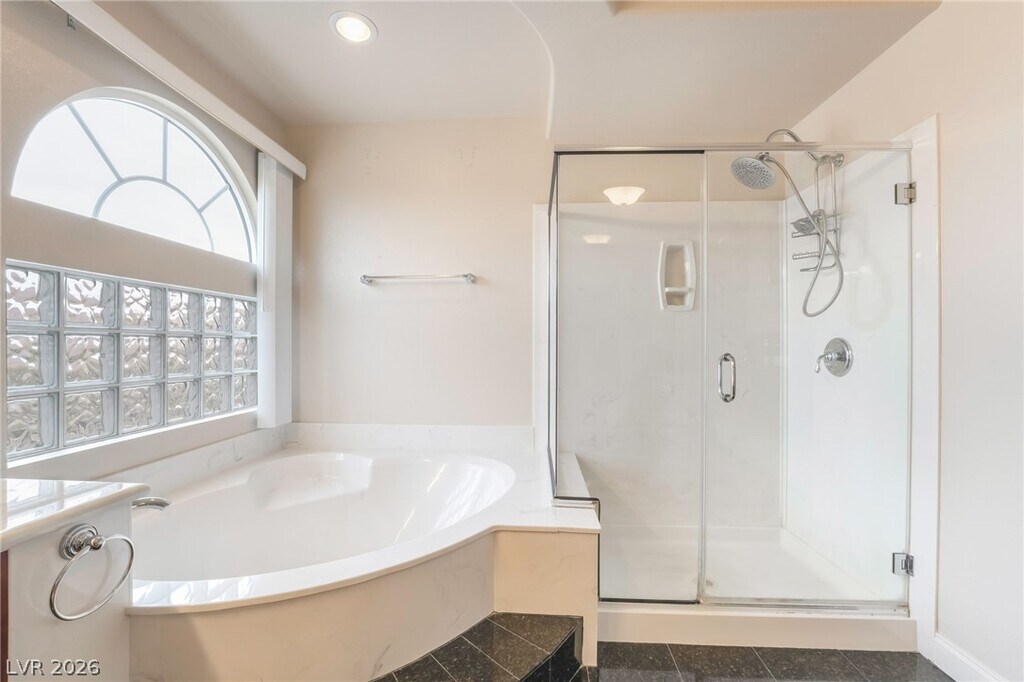 Situated in the desirable Coronado Ranch area of Southwest Las Vegas, this spacious two-story home offers five bedrooms and three full bathrooms with a layout designed for comfortable living and entertaining. The interior features custom flooring and paint, a formal sunken living and dining area that creates an inviting entry, and a large family room with a fireplace that flows into the kitchen. The kitchen is equipped with granite countertops, cherry-stained cabinetry, stainless steel appliances, and an oversized island that provides generous prep and gathering space. A downstairs bedroom and full bathroom offer added flexibility, while upstairs includes a versatile loft and well-sized secondary bedrooms. The primary suite provides a relaxing retreat with dual sinks, a Roman tub, and a separate shower. The backyard offers a peaceful outdoor setting with a covered patio, decorative fountains, landscaped planting areas, and a standalone BBQ grill. MLS ID 2763151