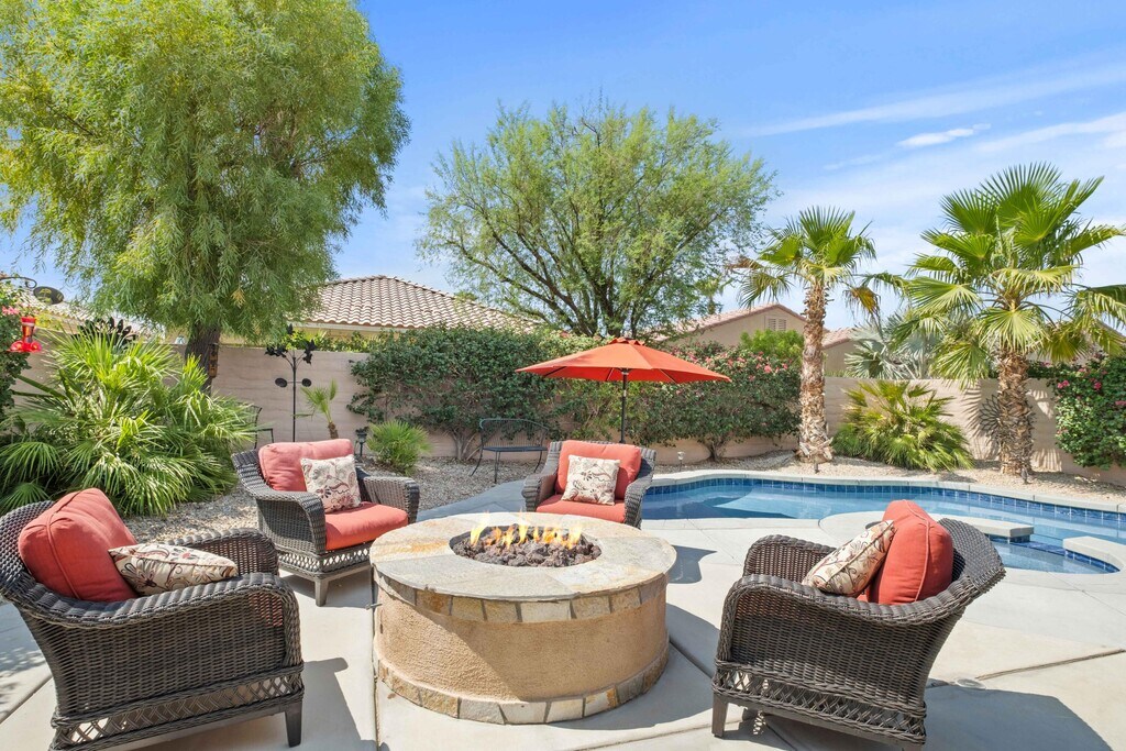 Rented Jan-March 2027. Welcome to this beautiful vacation home in the prestigious Sun City Shadow Hills community! This stunning two-bedroom with third bed in den and two-bathroom residence offers the perfect blend of luxury and comfort. As you step inside,you'll be greeted by an open-concept living space that seamlessly connects the living room,dining area,and gourmet kitchen,making it ideal for entertaining guests or enjoying a quiet night in. The master suite is a true retreat,featuring a spacious bedroom,walk-in closet,and an en-suite bathroom with dual vanities and a walk-in shower. The second bedroom is equally inviting,perfect for guests. Step outside to your private oasis where a sparkling pool and hot tub await. Imagine spending your evenings relaxing in the hot tub or hosting dinners by the pool. The backyard is beautifully landscaped,offering a serene setting for outdoor living. Sun City Shadow Hills is a vibrant 55+ community that boasts a plethora of amenities,including two golf courses,a state-of-the-art fitness center,tennis courts,and numerous social clubs. You'll also be conveniently located near popular dining spots like The Vue Grille & Bar and shopping centers such as the Indio Towne Center. Don't miss the opportunity to enjoy this exquisite home! Schedule a viewing today and experience the best of Sun City Shadow Hills living! Inquire about current availability. Booked December to Feb 2026. Booked April 2026. Booked Jan-March 2027. MLS # 219144680