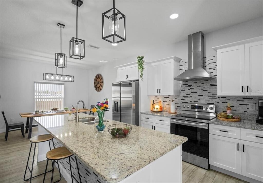 Welcome Home to your next home for rent! This beautiful 3 bedroom/2 bath home. Be the first to enjoy this fabulous place that features cathedral ceilings in the spacious living room and primary bedroom with the other rooms separate from it. The dinette has a plate-glass window that brings in natural light and gives you a great view of the oversized backyard. The kitchen is a chef's delight with an enormous island,granite countertops,energy-efficient Whirlpool appliances,and 36-inch cabinets. The cable is included and you will ve saving on the electricity because it has solar panels. Residents in this quiet neighborhood in Poinciana,Florida has access to baseball and soccer fields,basketball and volleyball courts,a playground,dog park,swimming pools,and nearby shopping,dining,and medical facilities. MLS# S5146939