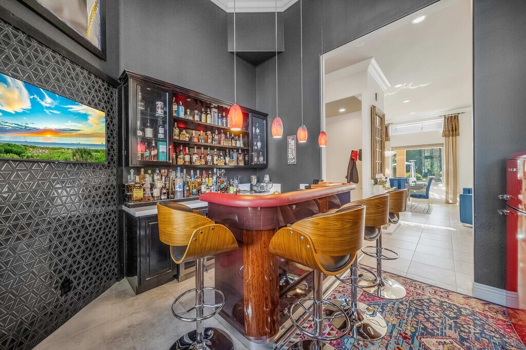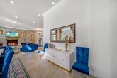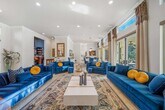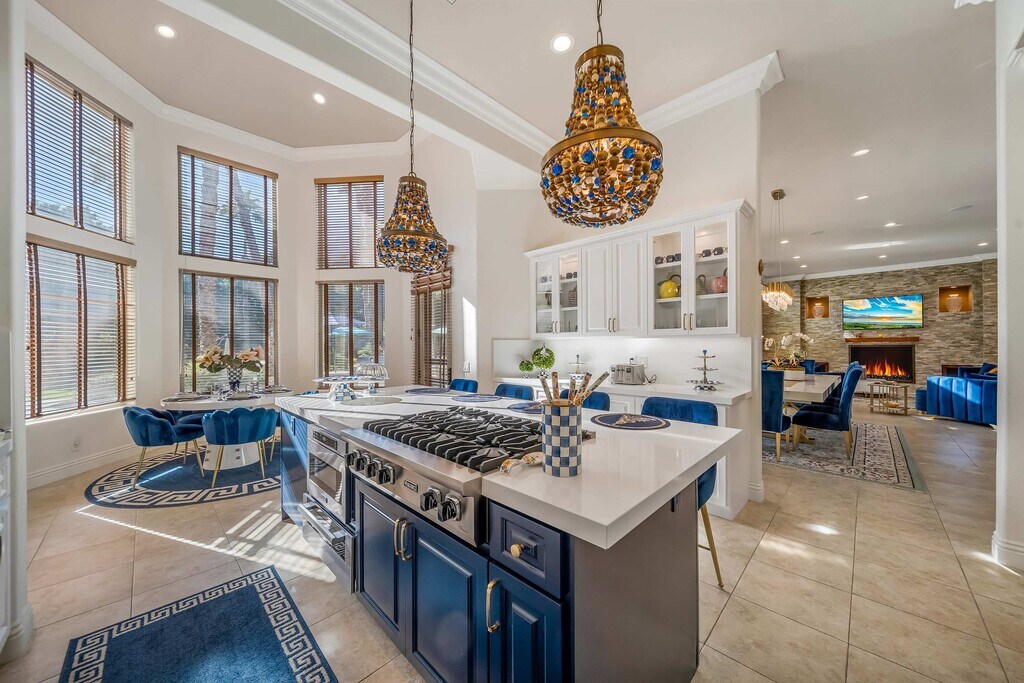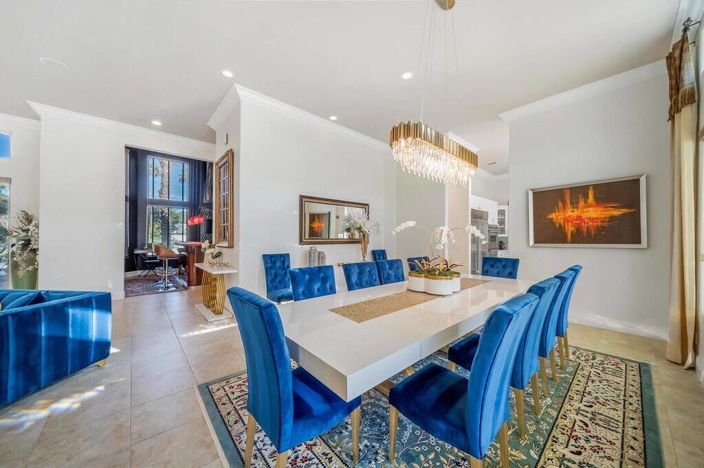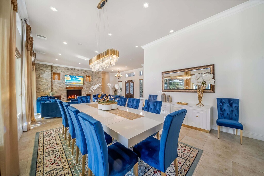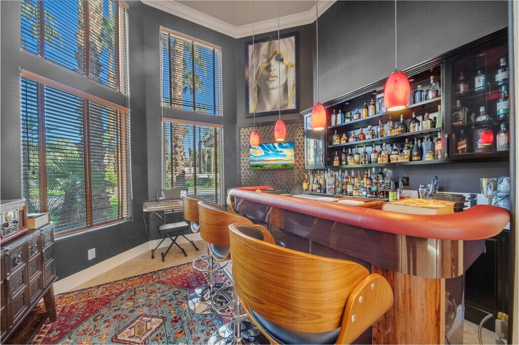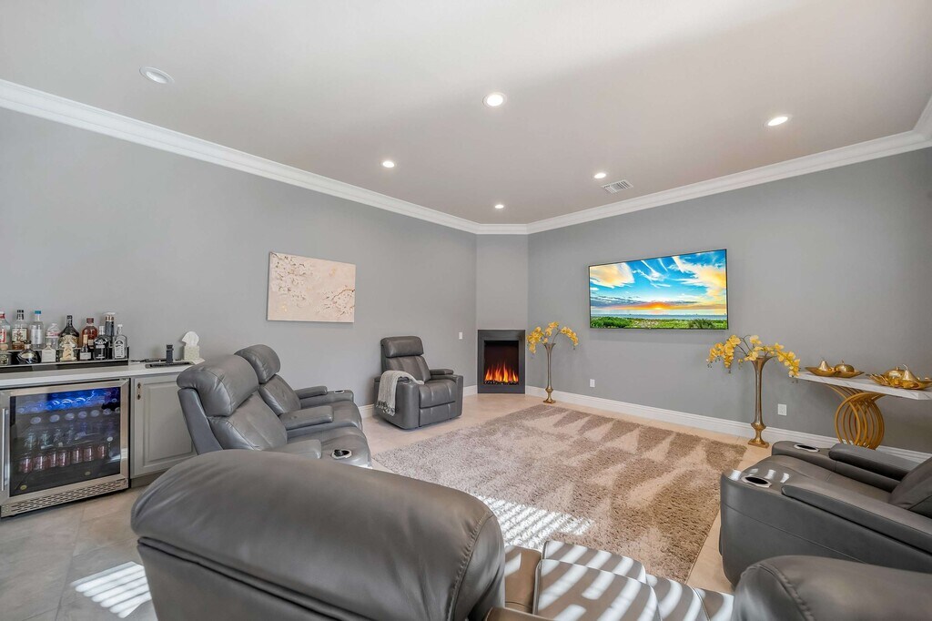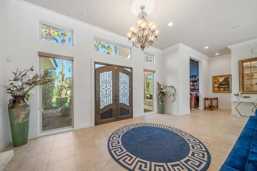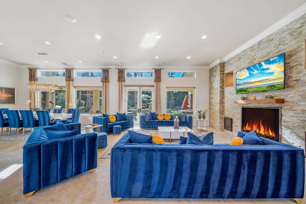 Casa Monte Grande is a private luxury estate inside the gated Estates at La Quinta, set on an expansive, beautifully landscaped property that feels more like a boutique resort than a single home. Inside, the spaces are generous and thoughtfully designed: a grand foyer with iron double doors and a chandelier, a designer blue-and-gold chef’s kitchen, a comfortable great room that opens to the pool, a dedicated indoor bar, and a cozy theater lounge with reclining leather seats. The primary suite feels like its own apartment, with a king bed, a fireplace, and a full sitting area with sofas, plus direct access to the patio. Every bedroom has its own ensuite bathroom and walk-in closet, and one wing of the home functions as a flexible family suite with multiple beds. Outside, Casa Monte Grande unfolds into a true oasis with a freeform pool and spa, large lawns, mature palms, a circular fire pit with built-in seating, a BBQ grill and shaded patio lounge for outdoor meals, and a unique wooden deck perched above a tranquil pond and waterfall. It’s a place designed for groups who want space to spread out, gather, relax, and genuinely enjoy being at home in the desert. *Rental rates vary by month, so please contact us for availability and pricing. Security Deposit: A refundable security deposit is required and will be collected prior to your stay. Full details provided upon booking. For long-term rentals, a California lease must be signed. Each rental includes utility caps for electricity, water, and gas, and the guest is responsible for any overages. The signing of the lease agreement must occur within 21 days of booking, provided the check-in date is more than 30 days away. If the check-in date is less than 30 days from the booking date, the lease agreement must be signed within 5 days of booking. Pets: Pets are subject to approval. Pet cleaning fees apply and vary depending on the breed and size. *Work vehicles are not permitted to be parked inside the community. The space From the moment you step through the wrought-iron double doors, Casa Monte Grande feels open and welcoming. The entry is bright, with high ceilings, tall windows, and a chandelier that sets a quietly grand tone. Straight ahead, the great room draws you in with deep blue velvet sofas, a stone accent wall, a fireplace with a mounted TV above, and wide views of the backyard. The room flows naturally into the kitchen and dining areas, making it easy for everyone to be together without feeling crowded. The kitchen is one of the showpieces of the home. It features an oversized island with waterfall-style countertops and velvet bar stools, white cabinetry with gold hardware, double ovens, a gas cooktop, and a large built-in refrigerator. Two mosaic chandeliers hang over the island, giving the space a warm evening glow. Just off the kitchen, a glass-wrapped breakfast area looks out onto the palms and gardens, while a formal dining area nearby seats a larger group comfortably and keeps meals connected to the heart of the home. The house includes several spaces designed purely for comfort and entertainment. One wing holds a dedicated theater lounge with four leather recliners arranged before a large TV and modern fireplace — ideal for movie nights or quiet downtime. Another room serves as a full indoor bar lounge, complete with custom shelving, bar seating, and tall windows that make it bright during the day and atmospheric at night. A foosball table adds a casual, fun touch without ever having to leave the comfort of the house. The primary suite at Casa Monte Grande is a retreat of its own. It features a king bed, a fireplace, and a full sitting area arranged with sofas and a mounted TV, creating a relaxed, private living space within the home. A sliding door provides direct access to the patio and yard. Attached to the suite is an oversized walk-in closet and a spa-like ensuite bathroom with stone finishes and a spacious shower, along with a dedicated office space nearby for anyone who needs a quiet place to work. The remaining bedrooms are designed with the same attention to comfort. Two guest suites each offer a large bed, a walk-in closet, and an ensuite bathroom finished in polished stone with stylish fixtures and walk-in showers. A private wing of the home holds a larger family-style suite with multiple beds, its own TV, a walk-in closet, and an ensuite bathroom — perfect for families or groups wanting extra space and privacy. Every bedroom feels self-contained, making the home especially comfortable for longer stays or mixed groups traveling together. Stepping outside, Casa Monte Grande truly feels like a resort. The backyard is anchored by a freeform pool with an integrated spa, surrounded by loungers and umbrellas, with real lawn and mature palms creating a sense of calm and privacy. A circular fire pit with curved built-in seating becomes the natural gathering point in the evenings, while the shaded patio off the great room offers comfortable seating and a BBQ grill for simple outdoor meals. At the far edge of the property, a wooden deck rises above a pond and waterfall, creating a peaceful hideaway for morning coffee, afternoon reading, or a quiet drink at sunset. The blend of indoor lounges, private bedroom suites, entertainment rooms, and layered outdoor spaces makes Casa Monte Grande a place you settle into and enjoy at an unhurried pace. Getting around For optimal transportation, a private car is recommended. Taxi services are available from Palm Springs airport, and both Uber and Lyft operate in the desert. Festival-goers will find these services to be affordable and convenient. Indulge in a delightful selection of fine wines, hand-crafted beers, and spirits while enjoying indoor entertainment or cozying up by the inviting fire pit. Other things to note Cable channel availability may vary. Check-in time is 4 PM, and check-out time is 11 AM. To reach the property, take Monroe Street South, until you reach Mountai