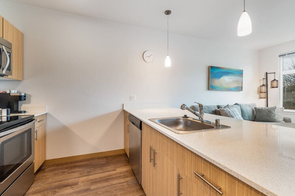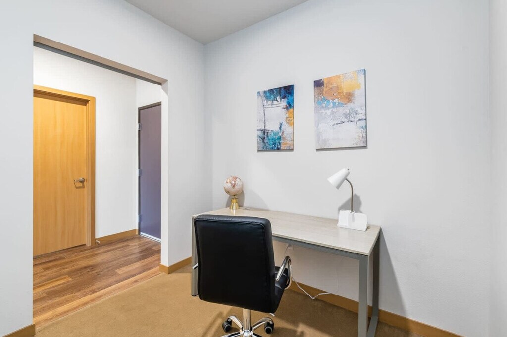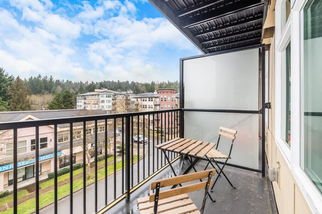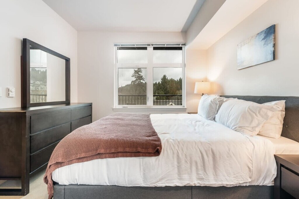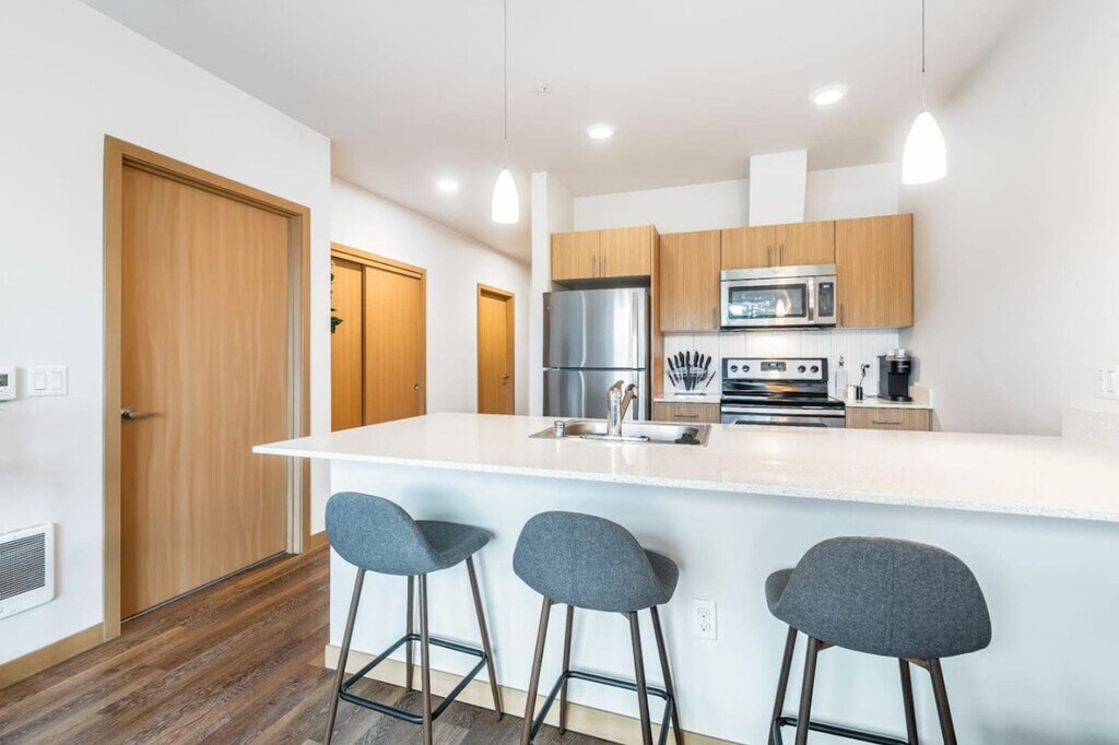 Feel at home in this fully furnished private 1-bedroom plus office suite nestled within a sophisticated modern apartment complex in downtown Redmond. The fully equipped kitchen boasts high-end appliances along with plates, glassware, silverware, pots, and pans. An in-home washer and dryer ensure added convenience. Stay entertained with a Smart TV featuring Prime, Hulu, Disney+, and Netflix for all your streaming desires. Complimentary amenities such as coffee, tea, paper towels, laundry and dishwasher pods, toilet paper, bath towels, soap, shampoo, and conditioner are provided as starter packs. Common area luxuries include a fitness center, clubhouse, pet hub, and game room. Pet enthusiasts rejoice as this apartment is pet-friendly with a fee of $25 per night (for stays up to 10 days) or a $250 flat rate fee (for stays exceeding 10 days) per pet, with a maximum of 2 pets. Reserve secure garage parking at $150/month or $10/day. Unreserved street parking is available free of charge. Downtown Redmond is known for its dynamic blend of urban amenities and suburban charm. The area boasts a mix of modern developments and a touch of historical character and is renowned for being the headquarters of Microsoft. You'll find a range of tech-oriented businesses, shops, cafes, and restaurants. The Redmond Town Center, a popular open-air mall, serves as a focal point for shopping, dining, and entertainment. Getting around is a breeze with convenient transportation options. There is no air conditioning, but fans will be provided. Check-in is at 4PM and check-out is at 11AM. Lost key fobs, parking remotes, or mail keys will be charged at $100 each. Booking requires ID verification and adherence to the rental agreement. Includes fast Wi-Fi, ensuring uninterrupted productivity. To ensure your convenience, remote check-in is offered for a seamless arrival experience. Prior to your stay, easy instructions to access the property will be provided. [SI]