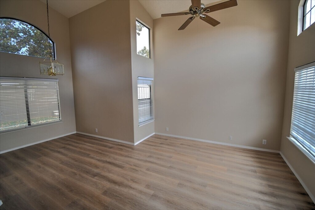 Tucked away on a cul-de-sac in the highly coveted La Cueva High School district, this beautiful 3-bedroom, 2.5-bath two-story home offers the perfect blend of comfort, style, and convenience in the desirable Norte Este Estates subdivision. Step inside and be greeted by gleaming with floors that flow throughout the light-filled main level. The spacious formal living room (17×15) seamlessly connects to a generous family room (22×13) featuring a cozy gas fireplace — ideal for relaxing evenings or entertaining friends. The updated kitchen boasts a freestanding gas range, built-in microwave, breakfast bar, and a Pella sliding door that opens directly to your private backyard oasis. Upstairs you’ll find all three bedrooms plus a versatile 10×11 loft — perfect as a home office, playroom, third family room.. The primary suite includes dual sinks, a relaxing garden tub, and plenty of natural light. Both full bathrooms have been tastefully appointed. Tenant is responsible for all utilities. Green Light Property Management, LLC