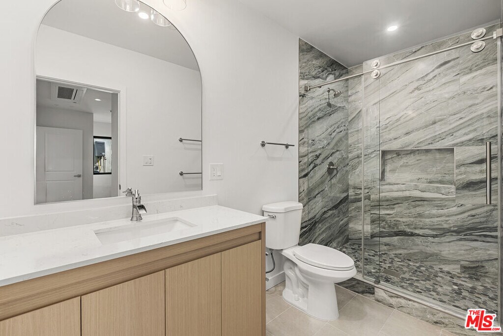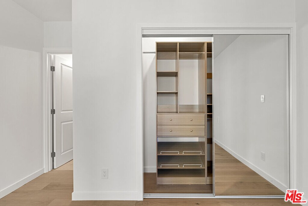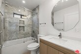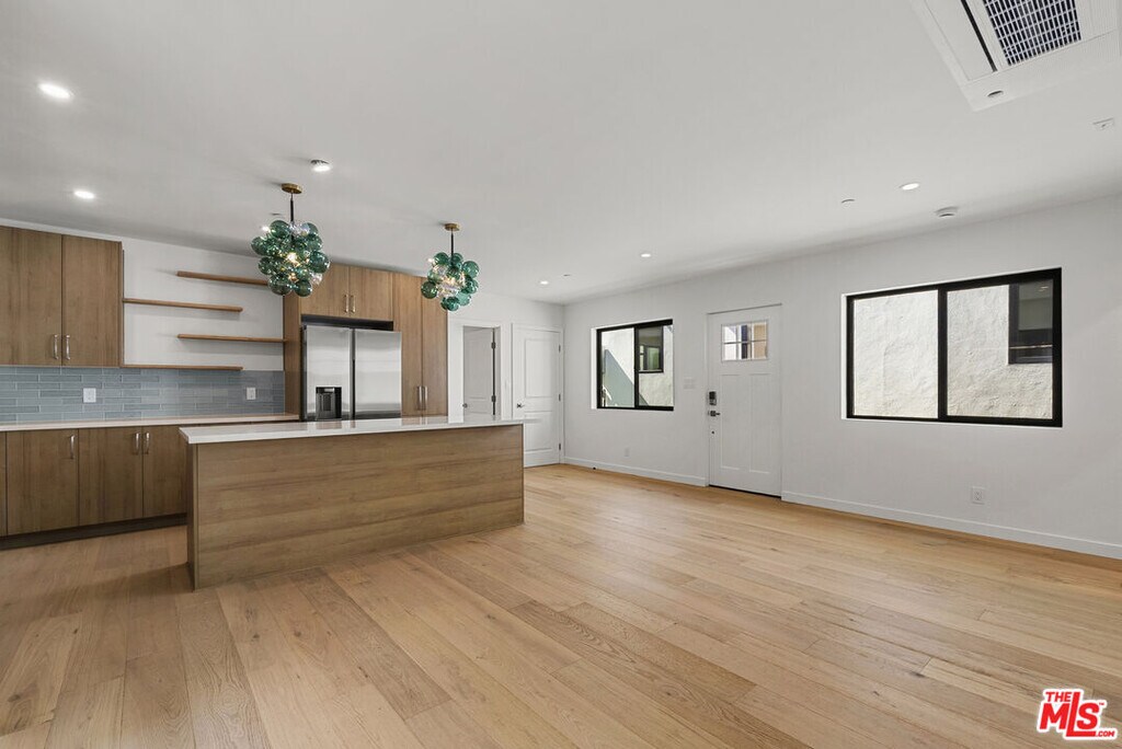 Welcome to this brand-new 2-bedroom, 2-bathroom ADU where modern design meets thoughtful detail. The heart of the home is a stunning open-concept kitchen featuring warm wood cabinetry, sleek white countertops, and a large center island. A soft blue glass tile backsplash adds a subtle pop of color, complemented by stainless steel appliances and statement green glass globe lighting. Both bedrooms are generously sized with mirrored closet doors and recessed lighting, while the bathrooms feature wood vanities and polished finishes. Located just north of Melrose Avenue, this ADU offers convenient access to shopping, dining, and major commuter routes in a peaceful residential setting. MLS# 26647855