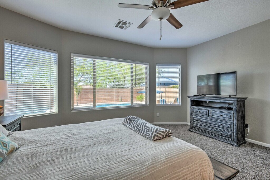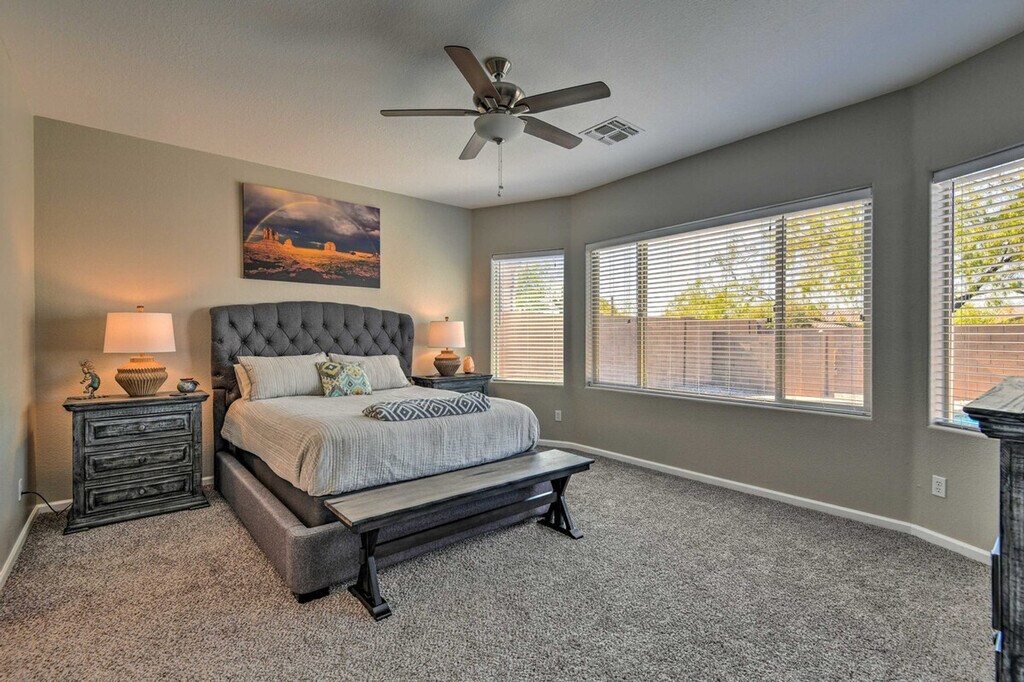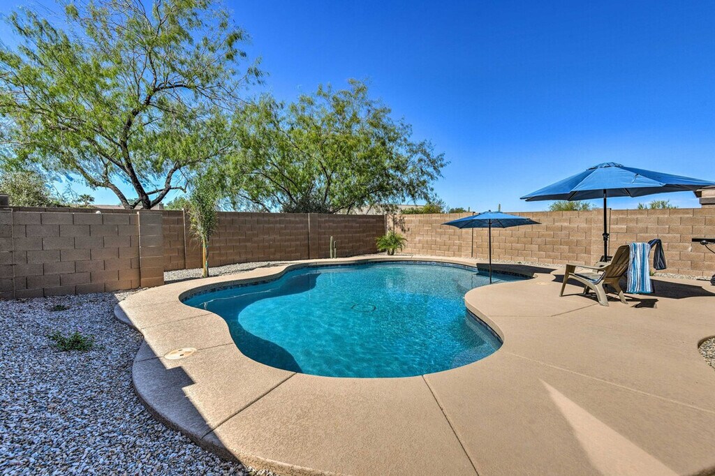 Feel at home in this Gold Canyon house, offering 1,300 sq ft of living space. This vacation rental home features 3-bedrooms and 2-bathrooms, situated in a peaceful gated community with views of Superstition Mountain and step-free access. This home features modern furnishings with a sectional sofa and flat-screen Smart TVs. The fully equipped kitchen includes cooking basics, stainless steel appliances, and a coffee maker. Enjoy linens, towels, free Wi-Fi, complimentary toiletries, trash bags, paper towels, a washer/dryer, central A/C, and beach chairs, towels, and an umbrella. Relax on the expansive patio with outdoor lounge chairs, cook out on the gas grill, and cool off in the private unfenced pool. Driveway parking is available for 2 vehicles. Travelers can leave the cold winter behind or simply get away at this home, surrounded by ample hiking opportunities and outdoor recreation in the Phoenix area, close to trails and golf courses. Smoking, pets, events, parties, and large gatherings are not allowed. Your safety matters. This property features 3 exterior cameras facing the front door, driveway, and pool equipment. They do not face the interior of the property and should not infringe on your privacy. Because the pool is not fenced, the property might not be suitable for young children; adult supervision is recommended. Garage and street parking are prohibited. [SI]