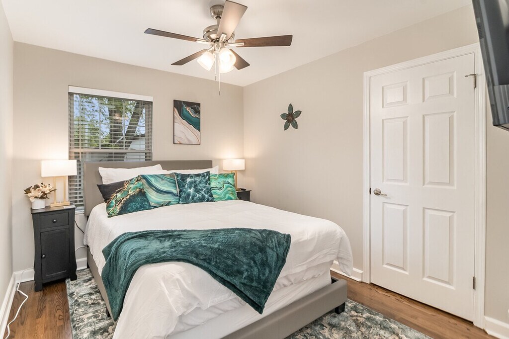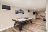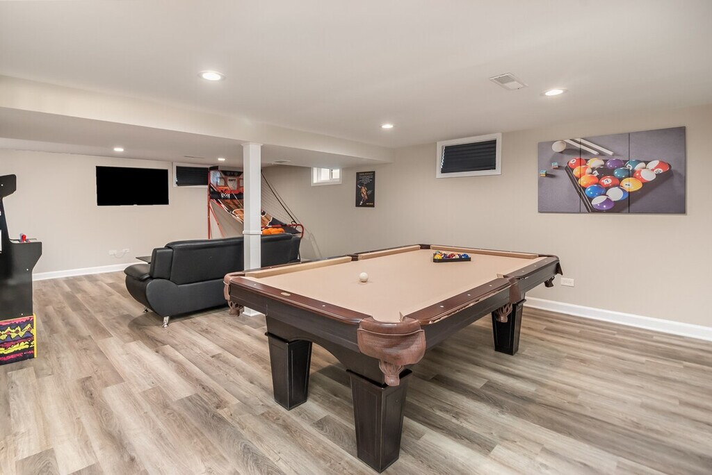 Feel at home in this renovated 2100 sq ft unit, located 7-9 minutes from interstate 90, providing easy access to O'Hare Airport and downtown. This home features 4 bedrooms and 2 full bathrooms. The updated home includes a modern kitchen with updated flooring. The basement offers entertainment options such as darts, a 2-player electronic basketball game, an arcade cabinet with 2,000 classic games, a pool table, and ping pong. There's also a lounge area with a sofa and TV, plus cards and board games. The kitchen is fully equipped with utensils, cooking spices, and oils. For entertainment, there are 6 LCD televisions with access to Hulu, Disney, and ESPN streaming services in English and Spanish. Netflix and Prime Video are also available with your own login. Enjoy up to 300 MBPS internet speed with Wi-Fi throughout the entire home and an ethernet hard line available. The living area and lounge area feature a 55" TV, and all 4 bedrooms have 40" TVs. A sound bar is included in the living room. For the young ones, there is a pack and play sleeper, a stroller, a high chair, and a booster seat. The property offers parking with a 2-car garage, driveway, and public parking. The 4th bedroom (lower level) does not have a window. If the home has a fireplace, it is not for guest use. [SI]