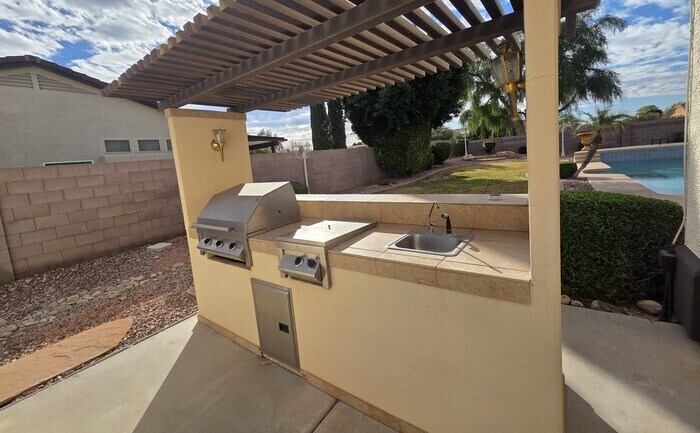 Gorgeous 5-bedroom, 3.5-bath home with upgrades throughout. Features a gourmet kitchen with large island and breakfast bar, white cabinetry, beautiful countertops, and a hooded smooth-top oven. Living room with gas fireplace, large family room, and two additional downstairs rooms ideal for an office/den or flex space, plus a downstairs bedroom and bath. Upstairs offers a spacious game room and oversized primary suite with private balcony access, walk-in glass shower, and separate garden tub. All bedrooms are generously sized. Enjoy a huge backyard with grass, extended covered patio, pool, spa, ramada with built-in BBQ and sink, double RV gate, and no rear neighbors—home sits next to a large greenbelt. Turf in the front yard 3-car garage. Well-decorated, well-maintained, and a must see. Property listed through McMath Realty LLC Edwina is the property manager for this property. Showings through Applications at Monthly rent $4,900.00 security deposit is $4,900.00 plus $200.00 lease admin fee. This property allows self guided viewing without an appointment. Contact for details.