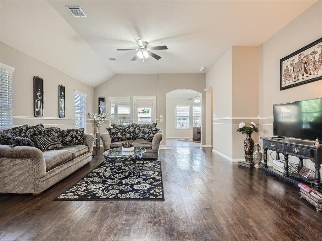 Beautifully landscaped and impeccably maintained, this stunning single-story home offers 2,143 square feet of light-filled, open-concept living designed for both comfort and entertaining. The thoughtfully designed floor plan features 3 spacious bedrooms, 2 full baths, a private study, and a formal dining area. The heart of the home is the expansive kitchen, showcasing granite countertops, a large center island, and seamless views into the living area—perfect for hosting family and friends. Rich wood flooring enhances the living space, while abundant windows invite in natural light throughout. The oversized primary suite impresses with vaulted ceilings and a spa-inspired bath featuring dual vanities, a walk-in shower, and generous closet space. Step outside to enjoy the large covered patio, ideal for relaxing or outdoor dining. Residents also enjoy exceptional community amenities including a resort-style swimming pool, walking and biking trails, soccer field, basketball court, and playground. Refrigerator, washer, and dryer are included for added convenience. Available 1/10/26.