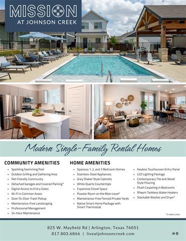 4 Weeks FREE Base Rent – Limited Time! Welcome home to Mission at Johnson Creek, where comfort meets convenience in the heart of Arlington. These beautifully designed one-, two-, three-bedroom townhomes, and attached duplexes feature modern stainless-steel appliances, smart-home features, and private maintenance-free fenced yards. Relax by the sparkling pool, entertain in the outdoor grilling area, and enjoy the convenience of detached garages. Located just minutes from Downtown Arlington, shopping, dining, and entertainment, including AMC The Parks at Arlington 18 and The Pose Haus Selfie Museum. Close to major employers such as Medical City Arlington, Arlington ISD, and American Airlines.