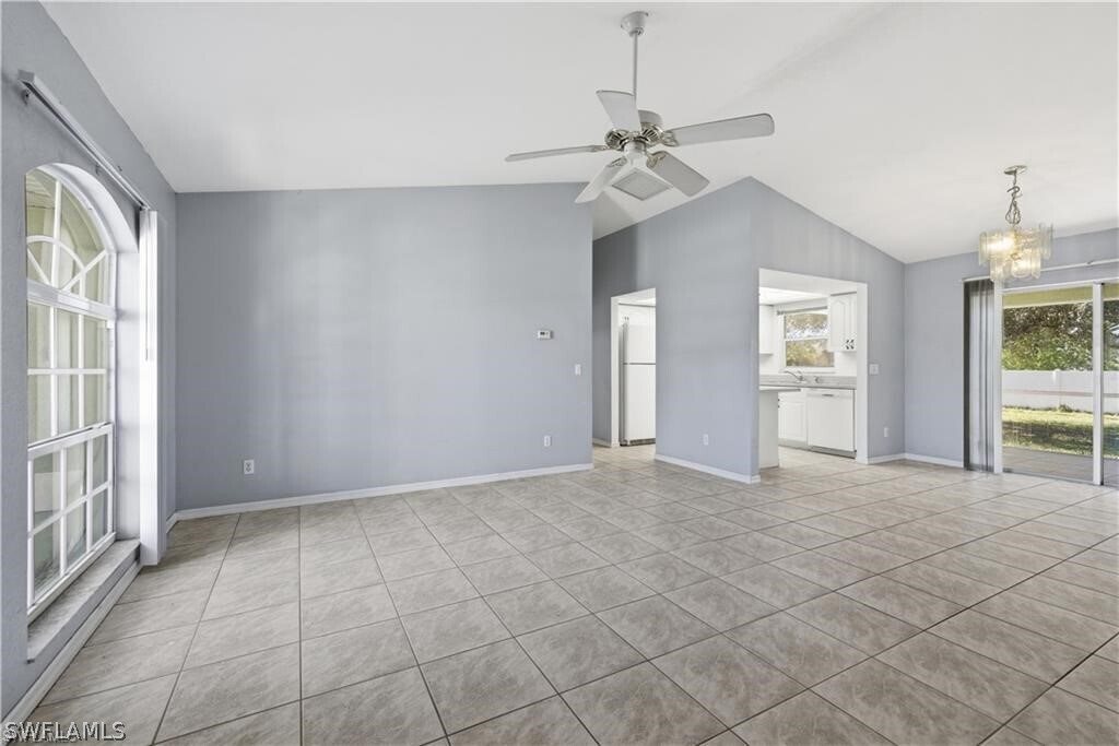 PRIME SE CAPE CORAL LOCATION! This move-in-ready 3BR/2BA single-family home offers 1,205 sq ft of functional living space on a sprawling quarter-acre lot. Highlights include a 2003 build,classic bright interior,and low-maintenance tile flooring throughout. The well-designed floor plan maximizes every square inch,featuring a sun-drenched living room that opens to an expansive backyard with endless possibilities for a pool or patio. Enjoy living minutes away from major roadways,retail hubs,and local parks. Whether you are a first-time buyer,downsizer,or savvy investor,this property delivers exceptional value in a high-demand area. No HOA fees!