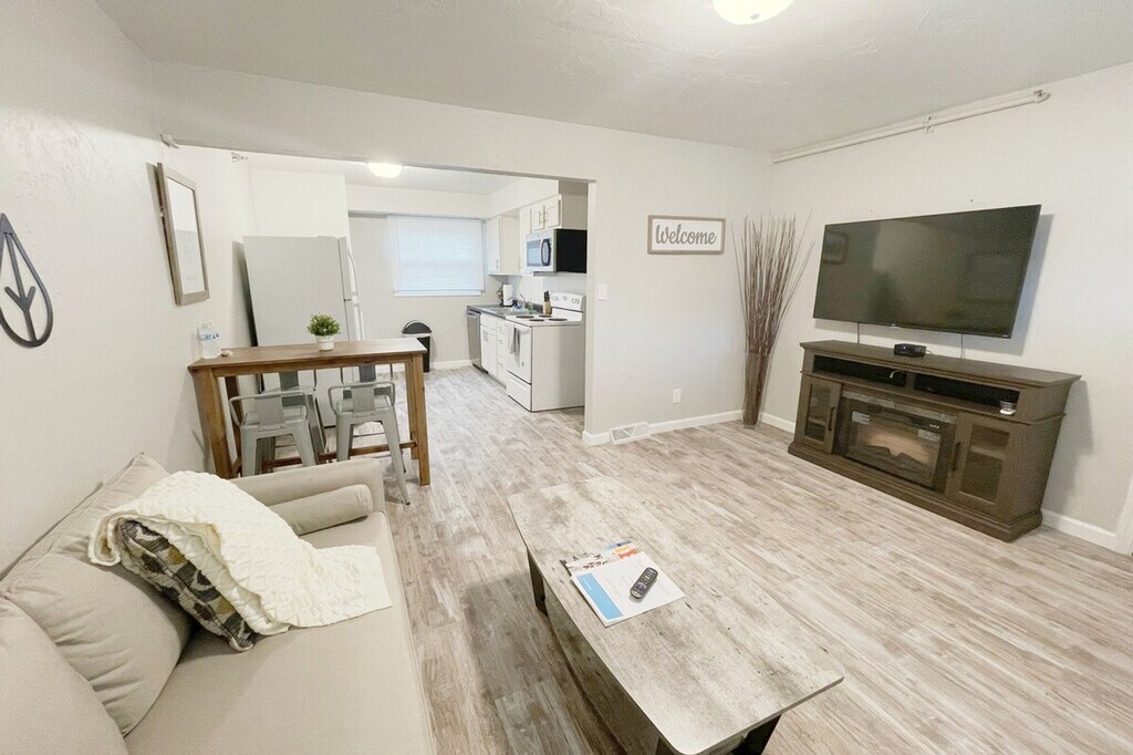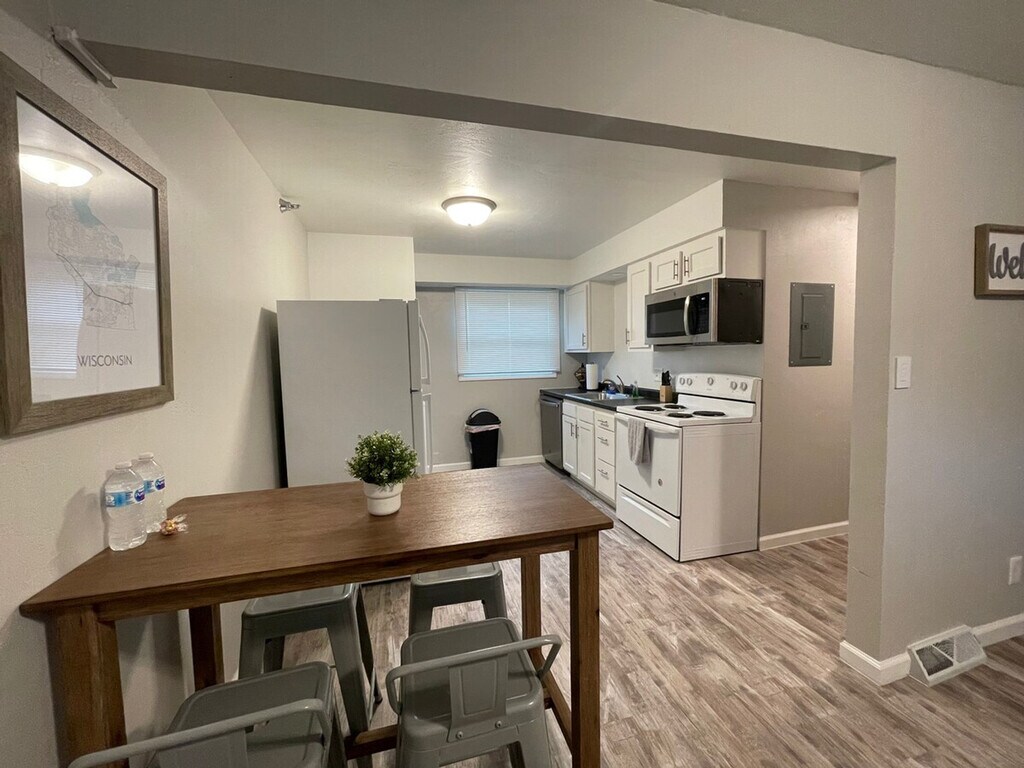 This remodeled apartment on the 1st floor boasts new kitchen cabinets, a modern bathroom, and updated flooring. Enjoy easy access to everything from this central location, with downtown less than 2 miles away and Lambeau Field just a 30-minute drive. Walk to major grocery and retail stores, with I-41 just minutes away. The unit is accessible via three steps. Feel at home with full access to the apartment's amenities, including a cozy living room with a comfortable sofa and a 55" HD Roku TV, a dining nook for intimate gatherings, and a fully equipped kitchen to enjoy meals with loved ones. The apartment offers 100mbps Wi-Fi and free unassigned parking behind the building. Guests are welcome to bring a maximum of two pets, with a charge of $150 per additional or unauthorized pet. Pet owners are responsible for tidying up after their pets, with a $50 fee for additional outdoor cleaning. Free unassigned parking is available behind the building. Explore the neighborhood with ease, as Walgreens is less than a 5-minute walk away. Drive times to popular destinations include Downtown Appleton in 5 minutes, Fox City Performance Arts Center in 3 minutes, and Appleton Airport (ATW) in 15 minutes. For medical professionals, the closest hospital is Appleton Medical Center, just 6 minutes away. Smoking or vaping of any kind inside the unit or garage is prohibited, with an additional cleaning fee of $500 per incident. Quiet hours are observed from 9 PM to 7 AM daily to ensure a peaceful environment for all guests and neighbors. Effortlessly enter the unit via smart lock, with a code provided 24-48 hours prior to your booking date. Please inform us in advance if there will be additional guests so we can provide extra towels if needed. [SI]