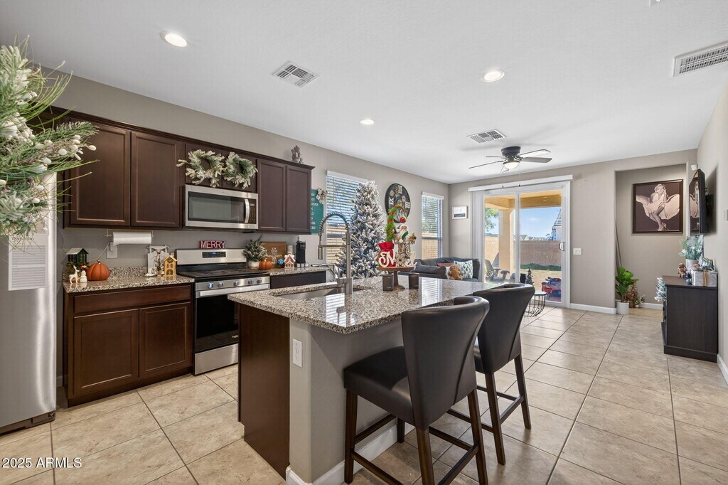 Beautiful,cozy single story home on a large corner lot located in the Anthem Merrill Ranch Community! Ready for a quick move in this home offers a dining area in the entryway,stainless steel kitchen appliances,granite countertops,open living area and tile throughout the home with carpet in the bedrooms. The master bedroom is spacious and bathroom includes a walk in shower. Large backyard and great community with access to resort like amenities including parks,community pool,workout facility,pickleball,spa and more!