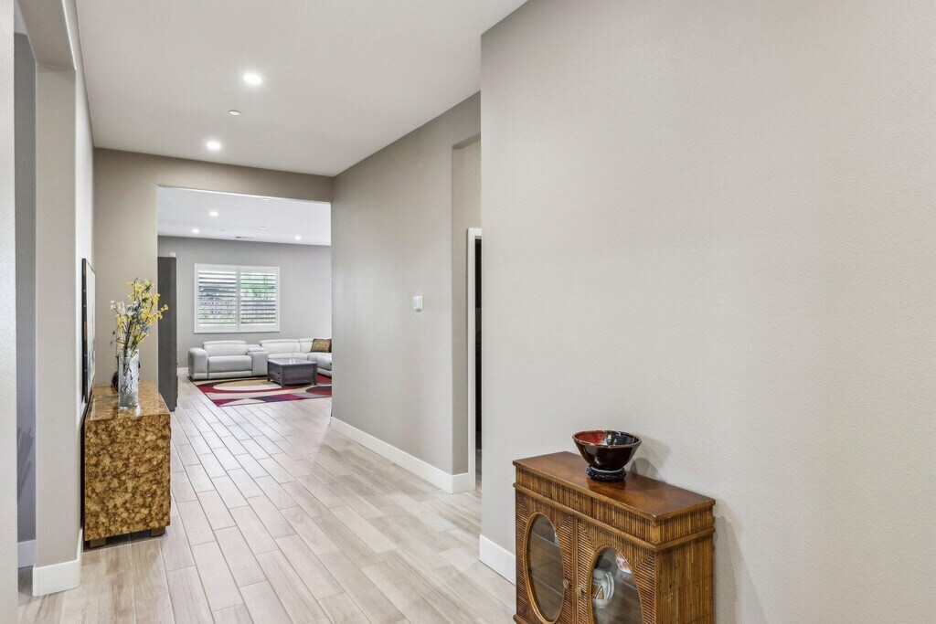 Step into the epitome of refined desert living with this stunning Liberty Plan (with a leased solar system),showcasing a timeless Tuscan façade behind the exclusive gates of Trilogy Polo Club. Designed for effortless elegance,this single-story masterpiece offers 2,367 sq. ft. of impeccable living space,including 3 bedrooms,3.5 baths,a versatile den/office,and a seamless open-concept great room. Elevated details abound,from upgraded baseboards and chic pocket sliders to striking plank flooring and classic Plantation shutters. The gourmet kitchen is a chef's dream,boasting stainless steel appliances,built-in ovens,a custom 6-burner gas cooktop with hood,quartz countertops,a designer tile backsplash,and a sprawling prep island with bar seating beneath stylish pendant lighting. Multiple guest suites with private en-suite baths ensure comfort and privacy for visiting friends and family. The primary retreat is a serene sanctuary,featuring a spa-inspired bath with dual vanities,quartz counters,and a jaw-dropping floor-to-ceiling glass shower with a rain-style showerhead. Step outside to an entertainer's paradise,where al fresco dining awaits under the covered patio,alongside a shimmering pebble tec spa cascading into a sleek rectangular poolall set within an expansive paver deck framed by decorative wrought iron fencing. With a dedicated laundry room and a golf cart garage,this home truly has it all. Schedule your private tour today!