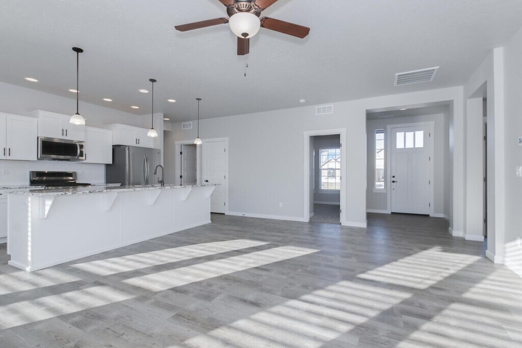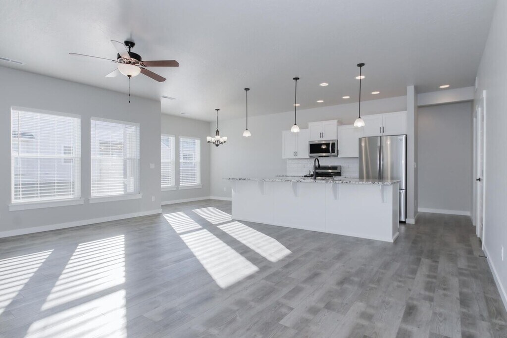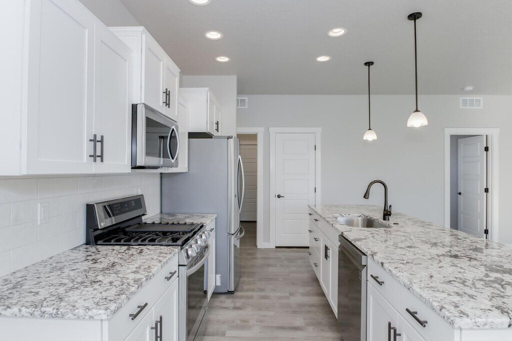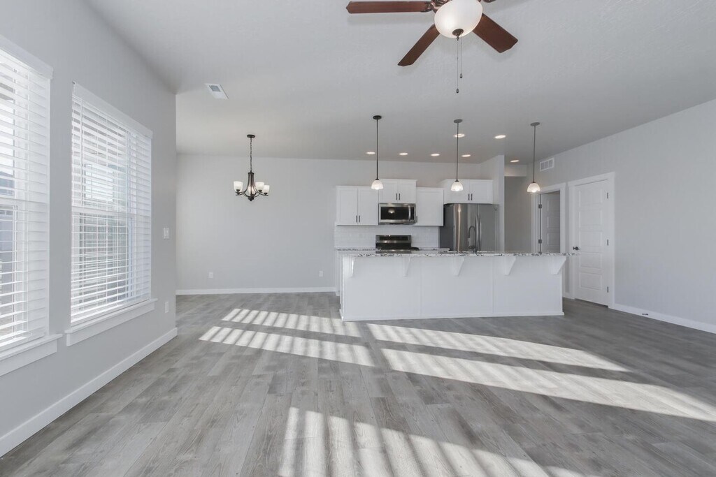 Newer Single-level home featuring 4 bedrooms, 2 bathrooms and large 3 car garage. Stunning kitchen features granite kitchen counter tops, full-tile back splash, brand new appliances & pantry. Open concept living & dining areas with an abundance of natural light. Master suite offers walk-in closet & private bathroom with double vanity. Fully landscaped with great location on low traffic street backing up to Ridgevue High Schools. Tenant is responsible for all utilities and landscaping. Pets accepted upon approval. Be the first to call it home! Call Amanda to schedule a viewing at or Apply at