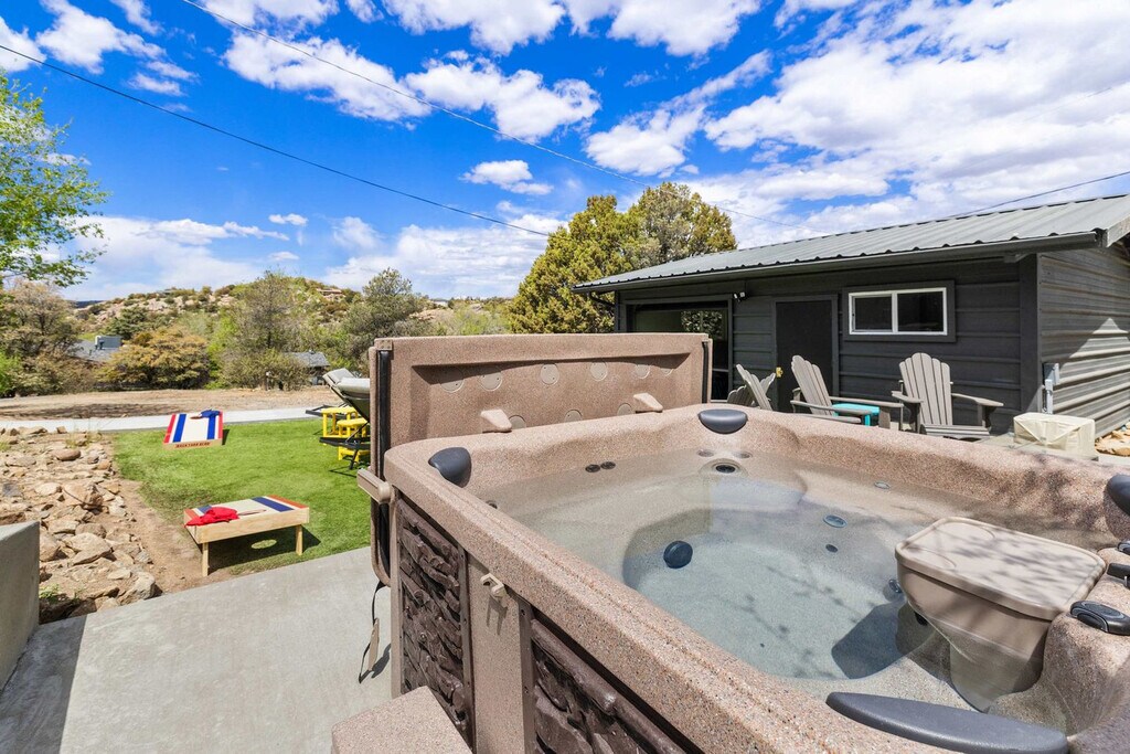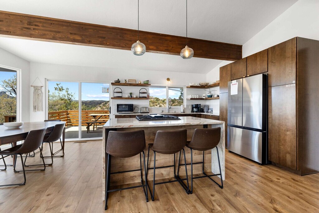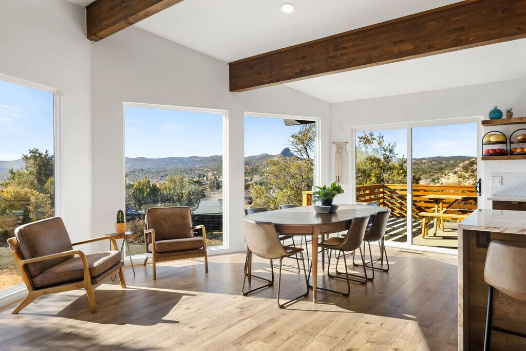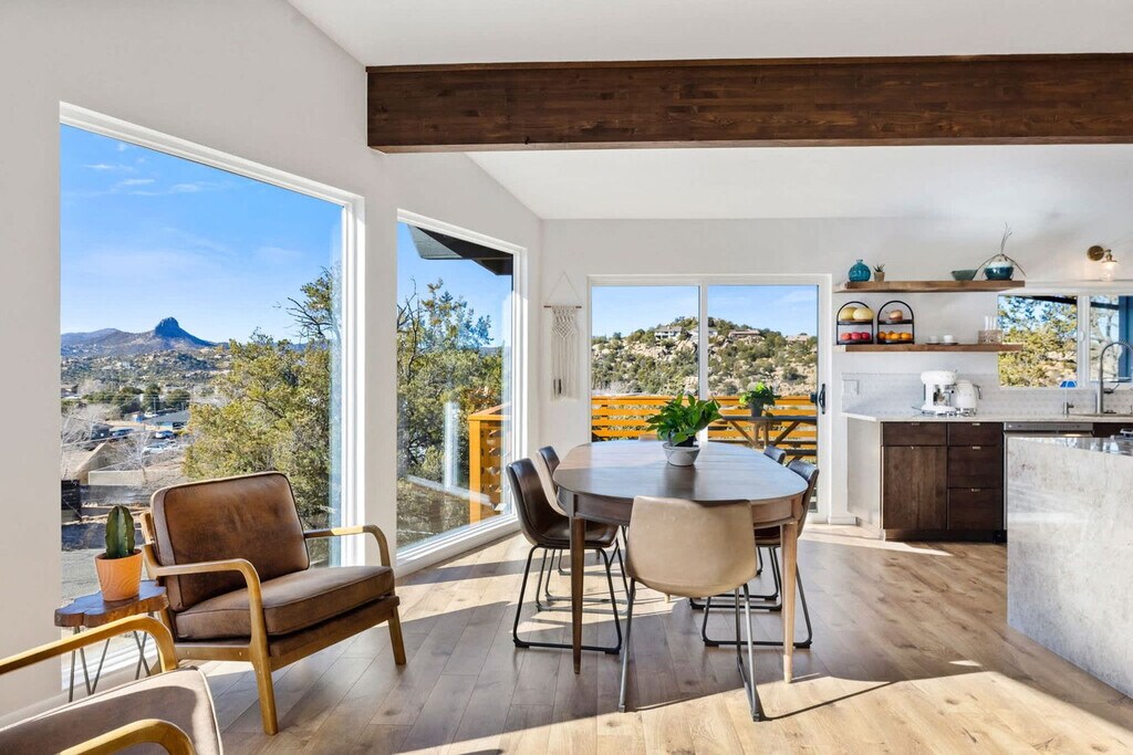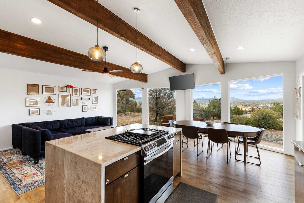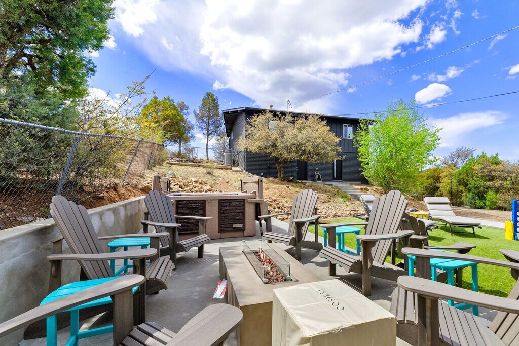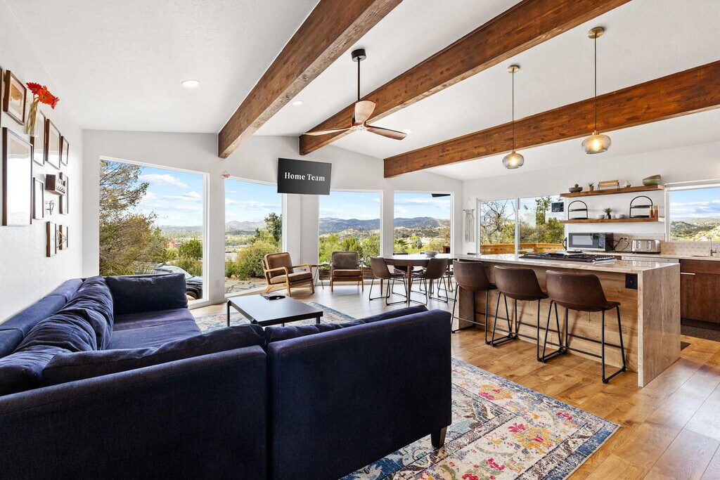 Feel at home in this 5-bedroom, 3-bathroom mid-century modern home in Prescott, perfect for up to 12 guests. Perched on a private half-acre, this home offers nearly 360-degree views of historic downtown Prescott. This home is equipped with expansive windows offering stunning mountain views, a hot tub, a fire pit, a home gym, a movie theater, an outdoor patio/dining area, a barbecue grill, and high-speed Wi-Fi. The fully stocked chef’s kitchen features high-end stainless appliances, ample cabinetry, and a large island with high seating. The lower level includes a kitchenette with a mini fridge, coffee maker, dishes, and utensils. Enjoy the living room with a smart flat-screen TV and a large plush sofa, or the movie room with two plush sofas, a projector, and a movie screen, as well as a mini fridge and microwave. Outdoor amenities include corn hole, giant connect 4, and ample outdoor seating. Up to 2 dogs are allowed for a fee of $125 per stay. Walk to Dignity Health, schools, and shopping, and enjoy easy access to downtown Prescott, Whiskey Row, lakes, and trails. Nearby attractions include The Courthouse Square Plaza (~2.5 miles), Watson Lake Park (~3.5 miles), Willow Lake (~4 miles), Thumb Butte (~6–7 miles), Heritage Park Zoological Sanctuary (~4 miles), and Goldwater Lake (~5 miles). Explore restaurants like El Gato Azul (~3.2 miles), Farm Provisions (~3.1 miles), Bistro St. Michael (~3 miles), The Palace Restaurant & Saloon (~3 miles), and Raven Cafe (~3 miles). No parties or events are allowed, and violations may result in immediate termination of the stay. An exterior camera is installed solely to monitor the cleaning team for quality and security purposes. Parking is available for 2 vehicles in the driveway and an additional 6 cars in the lower lot; street parking is not allowed. Guests must be 25 years or older to book this property. Check-in is at 4pm and check-out is at 10am. We kindly ask that you keep your dog off of the furniture, that your dog is crate trained, and that you pick up after them. Bedroom 3 includes a dedicated workspace. [SI]