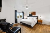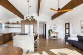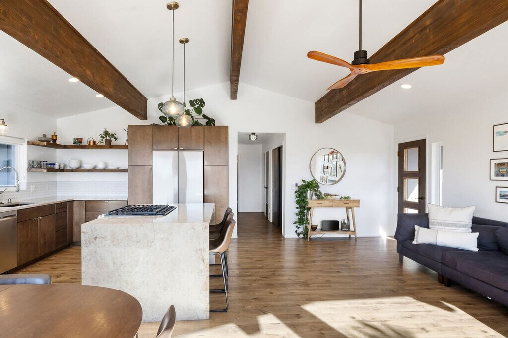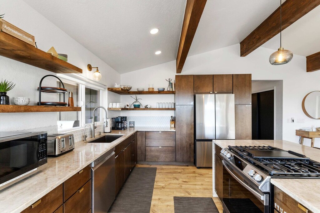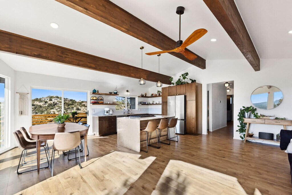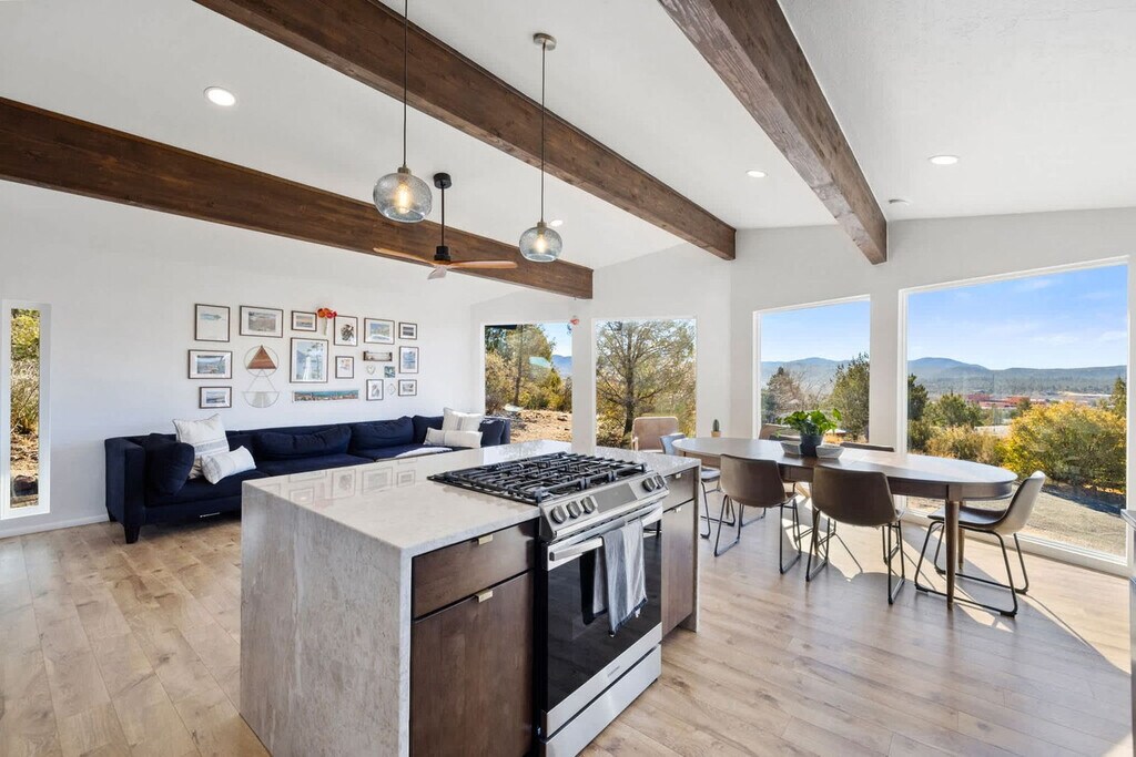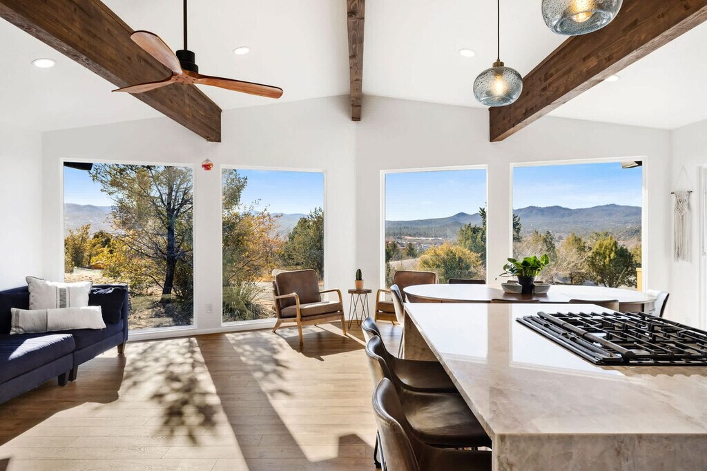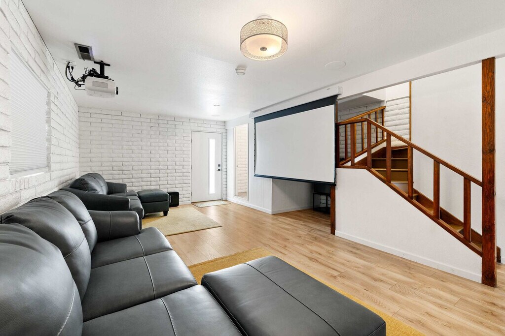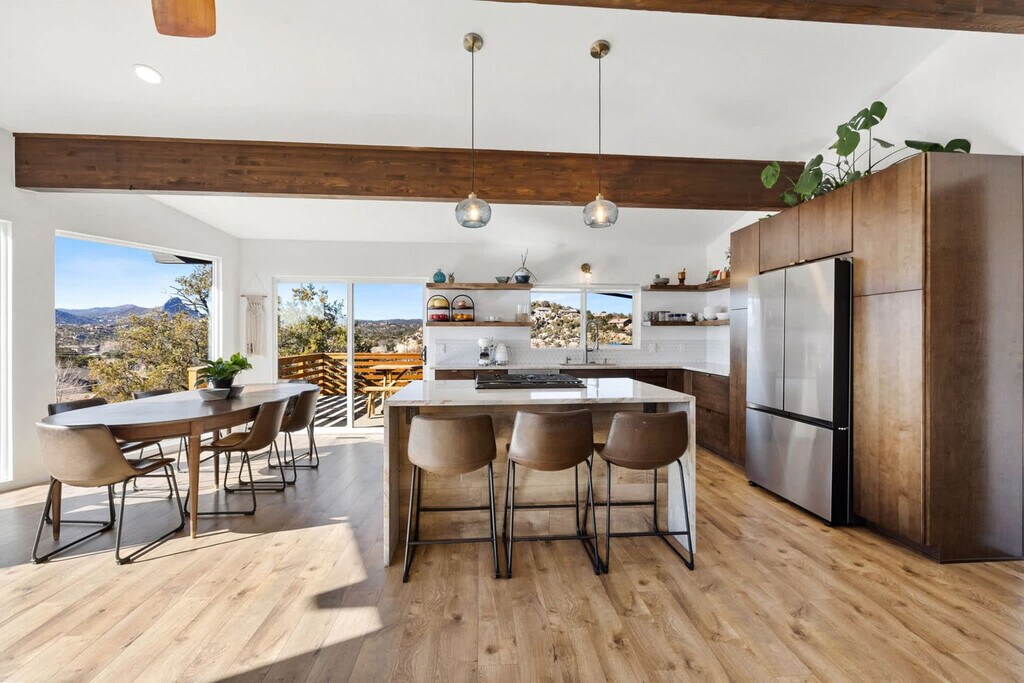 Feel at home in this 5-bedroom, 3-bathroom mid-century modern home in Prescott, perfect for up to 12 guests. Perched on a private half-acre, this home offers nearly 360-degree views of historic downtown Prescott. This home is equipped with expansive windows offering stunning mountain views, a hot tub, a fire pit, a home gym, a movie theater, an outdoor patio/dining area, a barbecue grill, and high-speed Wi-Fi. The fully stocked chef’s kitchen features high-end stainless appliances, ample cabinetry, and a large island with high seating. The lower level includes a kitchenette with a mini fridge, coffee maker, dishes, and utensils. Enjoy the living room with a smart flat-screen TV and a large plush sofa, or the movie room with two plush sofas, a projector, and a movie screen, as well as a mini fridge and microwave. Outdoor amenities include corn hole, giant connect 4, and ample outdoor seating. Up to 2 dogs are allowed for a fee of $125 per stay. Walk to Dignity Health, schools, and shopping, and enjoy easy access to downtown Prescott, Whiskey Row, lakes, and trails. Nearby attractions include The Courthouse Square Plaza (~2.5 miles), Watson Lake Park (~3.5 miles), Willow Lake (~4 miles), Thumb Butte (~6–7 miles), Heritage Park Zoological Sanctuary (~4 miles), and Goldwater Lake (~5 miles). Explore restaurants like El Gato Azul (~3.2 miles), Farm Provisions (~3.1 miles), Bistro St. Michael (~3 miles), The Palace Restaurant & Saloon (~3 miles), and Raven Cafe (~3 miles). No parties or events are allowed, and violations may result in immediate termination of the stay. An exterior camera is installed solely to monitor the cleaning team for quality and security purposes. Parking is available for 2 vehicles in the driveway and an additional 6 cars in the lower lot; street parking is not allowed. Guests must be 25 years or older to book this property. Check-in is at 4pm and check-out is at 10am. We kindly ask that you keep your dog off of the furniture, that your dog is crate trained, and that you pick up after them. Bedroom 3 includes a dedicated workspace. [SI]