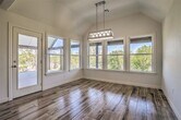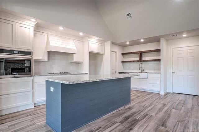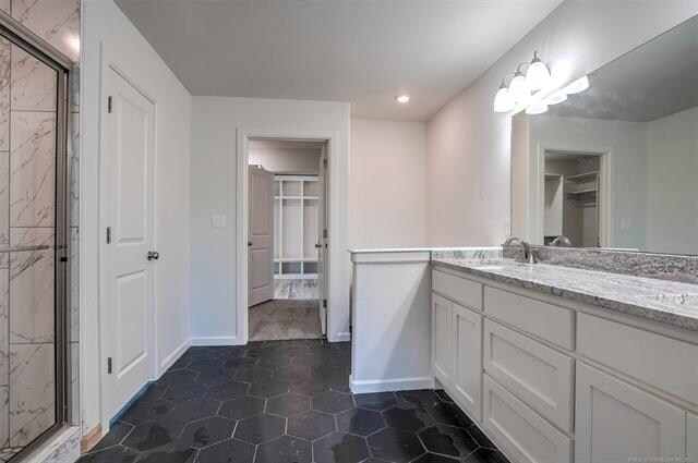 Large covered patio overlooks wooded green belt. Newly constructed single story 4 bedroom in Verdigris School District. Open concept with split bedroom design. Hard surface flooring throughout living areas. Carpeting in bedrooms. Vaulted beamed ceilings adorn the living and kitchen. Gas log fireplace, built-in bookcases, shelves, and large windows in living. Granite island and countertops, stainless appliances, farmhouse sink, and large walk-in pantry in kitchen. Mudroom with cubbies. Master bedroom and private bath with oversized walk-in shower, soaking tub, double sinks, and walk-in closet. Close proximity to schools, shopping, restaurants, entertainment and quick access to expressways, downtown Tulsa, and Tulsa International Airport.
