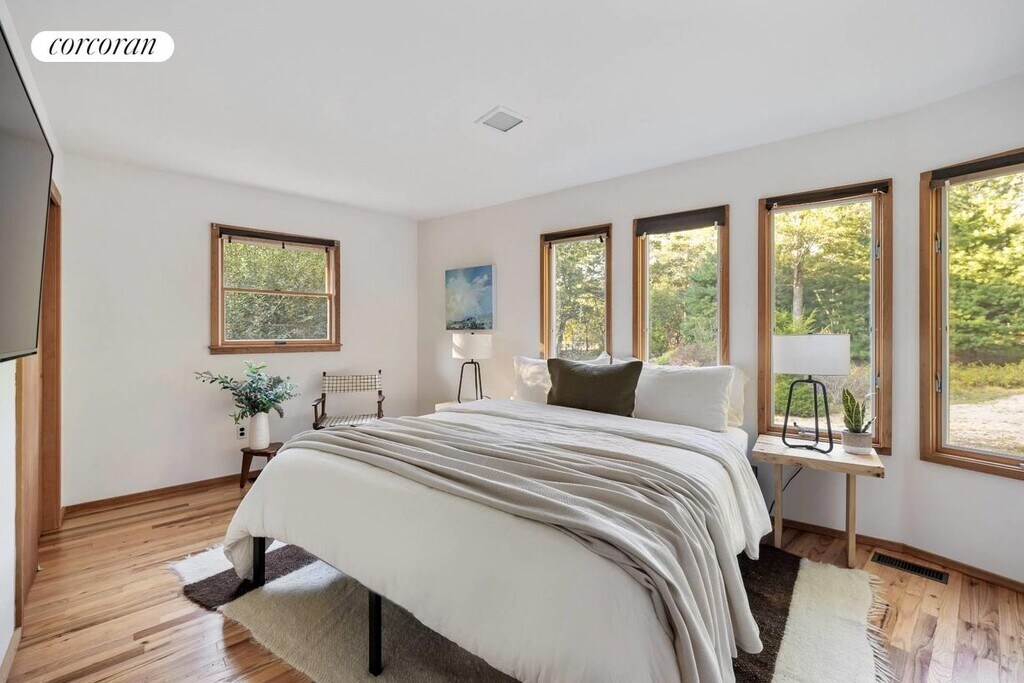 Located just 2 blocks from Sammy's Beach, in East Hampton, unwind at this stunning original Mid-Century home. This freshly renovated two story, three bedroom, two bath house was built with oak floors, cedar clad walls and ceiling, and antique details for a luxurious yet charming feel. It features a double height living area with floor to ceiling windows, wood burning stove, and integrated fully equipped kitchen and dining areas. Sliding glass doors lead to the expansive wraparound deck with Barbecue, dining and lounge areas, outdoor shower, and the large yard with seating and a firepit. The bedrooms are generously proportioned with 2 king and 1 queen beds, and upstairs there is a dedicated office and work out area with its own walkout balcony. Though quiet and elegant in nature, the home is modern where it counts. It features two large flatscreen TVs, 1 GB wi-fi and unlimited music and sound capabilities in every room. Enjoy long days on the beach, paddle board or kayak in Three Mile Harbor, or hikes through the nearby 116 acre Sammys Beach Nature preserve. Conveniently located 2 blocks from Sammys Beach, 7 minutes to East Hampton Village and only 10 minutes from Sag Harbor, the home is a true East End escape. [[Rental Registration # 25-1082]]