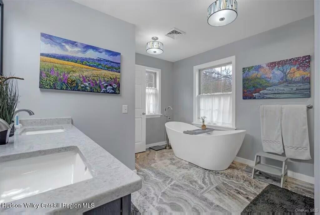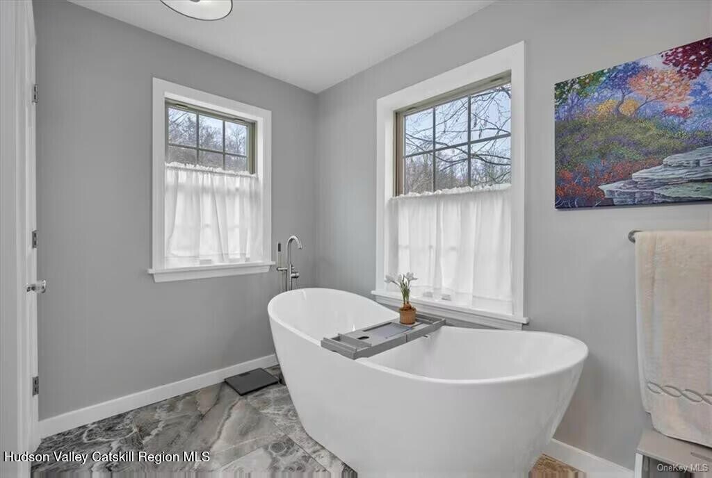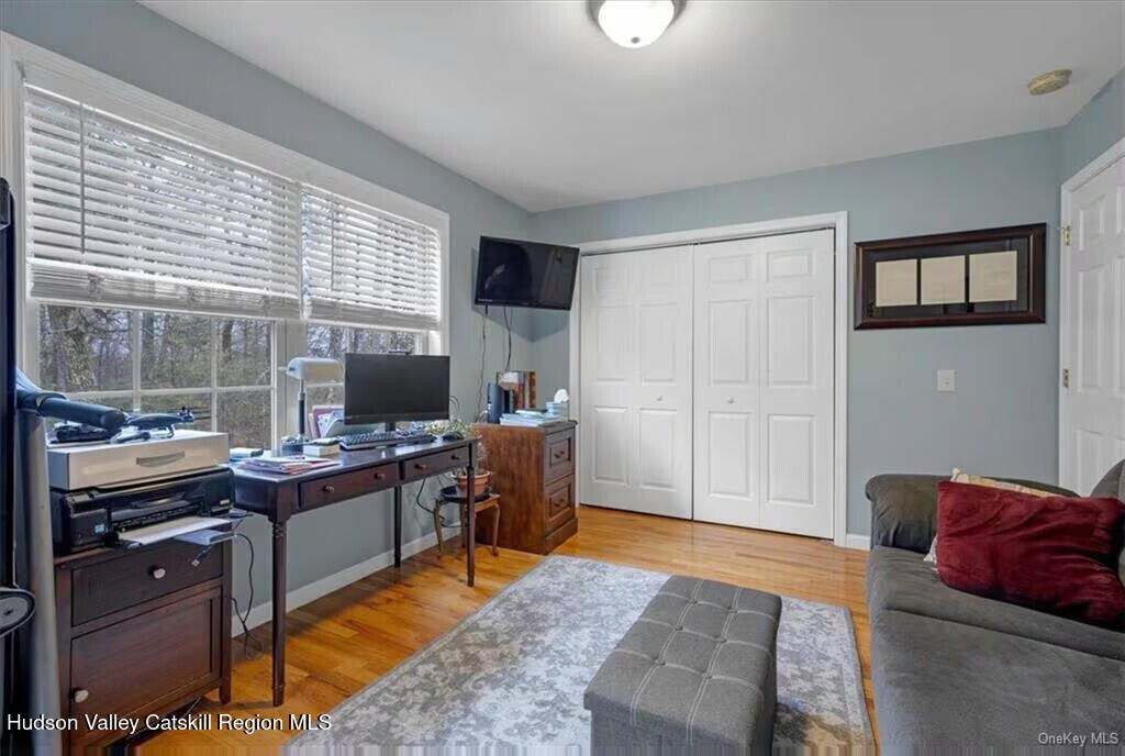 Enjoy sweeping Shawangunk and Catskill Mountain views from this bright,well-appointed home conveniently located between Kingston and the Village of New Paltz. Filled with natural light,the great room features cathedral ceilings,hardwood floors,and a propane fireplace—perfect for relaxing or entertaining. The open-concept kitchen offers stainless steel appliances,granite countertops,custom maple cabinets with self-closing drawers,and a center island,making it ideal for everyday living and hosting. The main level includes two bedrooms,a full bathroom,and in-unit washer and dryer. Upstairs,the spacious primary suite faces the mountains and includes a walk-in closet and ensuite bathroom with a soaking tub and separate shower. A den/home office with custom built-in shelving provides additional flexible space for remote work or hobbies. The finished walkout basement includes a full bathroom and can be used as a home office,gym,yoga studio,or playroom. Outside,enjoy the patio and unwind in the hot tub while taking in the stunning mountain scenery. This home is perfect for full-time living or a weekend retreat,just 20 minutes to Poughkeepsie and approximately 90 minutes from NYC,with convenient access to planes,trains,and the NYS Thruway. Tenants are responsible for all utilities,including electric,propane (heating and cooking),garbage,cable/Wi-Fi,lawn care,and snow removal. Pets considered.