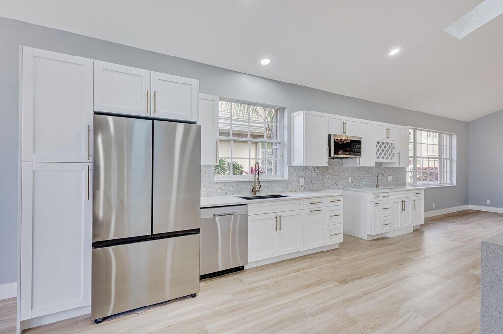 WELCOME to an expansive single-level newly renovated modern home w/ 4 bedrooms, 3 en-suite bathrooms (+ half bath). Includes screened, heated pool & spa located directly on the golf course w/ amazing sweeping lake & course views, + privacy landscaping. Everything is brand new including an amazing open kitchen w/ soaring ceiling, attached 2-car garage, stainless steel appliances, gas stove, wet bar, wine refrigerator & rack, ''spa-like'' master bathroom w/ powered lit mirrors, soaking tub, rainfall shower, heated towel rack & private water closet. Located in a private enclave inside of Ironhorse CC, a 24-hour guard gated community, offering endless nature, golf and lakes. Access to private PGA National amenities available and the ability to pay as you play. Open to furnishing for season.